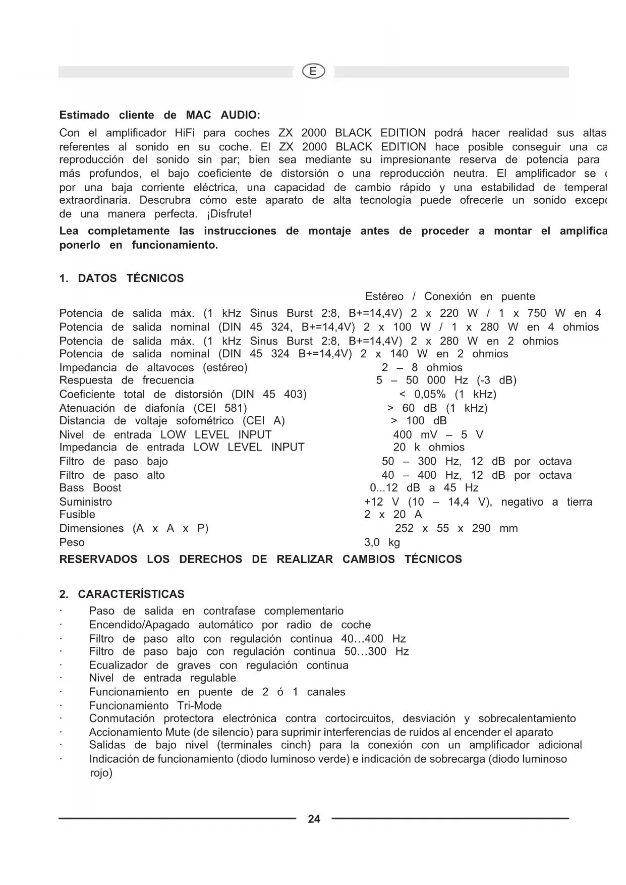 Estimado cliente de MAC AUDIO: Con el amplificador HiFi para coches ZX 2000 BLACK EDITION podrá hacer realidad sus altas exigencias referentes al sonido en su coche. El ZX 2000 BLACK EDITION hace posible conseguir una calidad de reproducción del sonido sin par; bien sea mediante su impresionante reserva de potencia para los bajos más profundos, el bajo coeficiente de distorsión o una reproducción neutra. El amplificador se caracteriza por una baja corriente eléctrica, una capacidad de cambio rápido y una estabilidad de temperatura extraordinaria. Descrubra cómo este aparato de alta tecnología puede ofrecerle un sonido excepcional de una manera perfecta. ¡Disfrute! Lea completamente las instrucciones de montaje antes de proceder a montar el amplificador y ponerlo en funcionamiento.