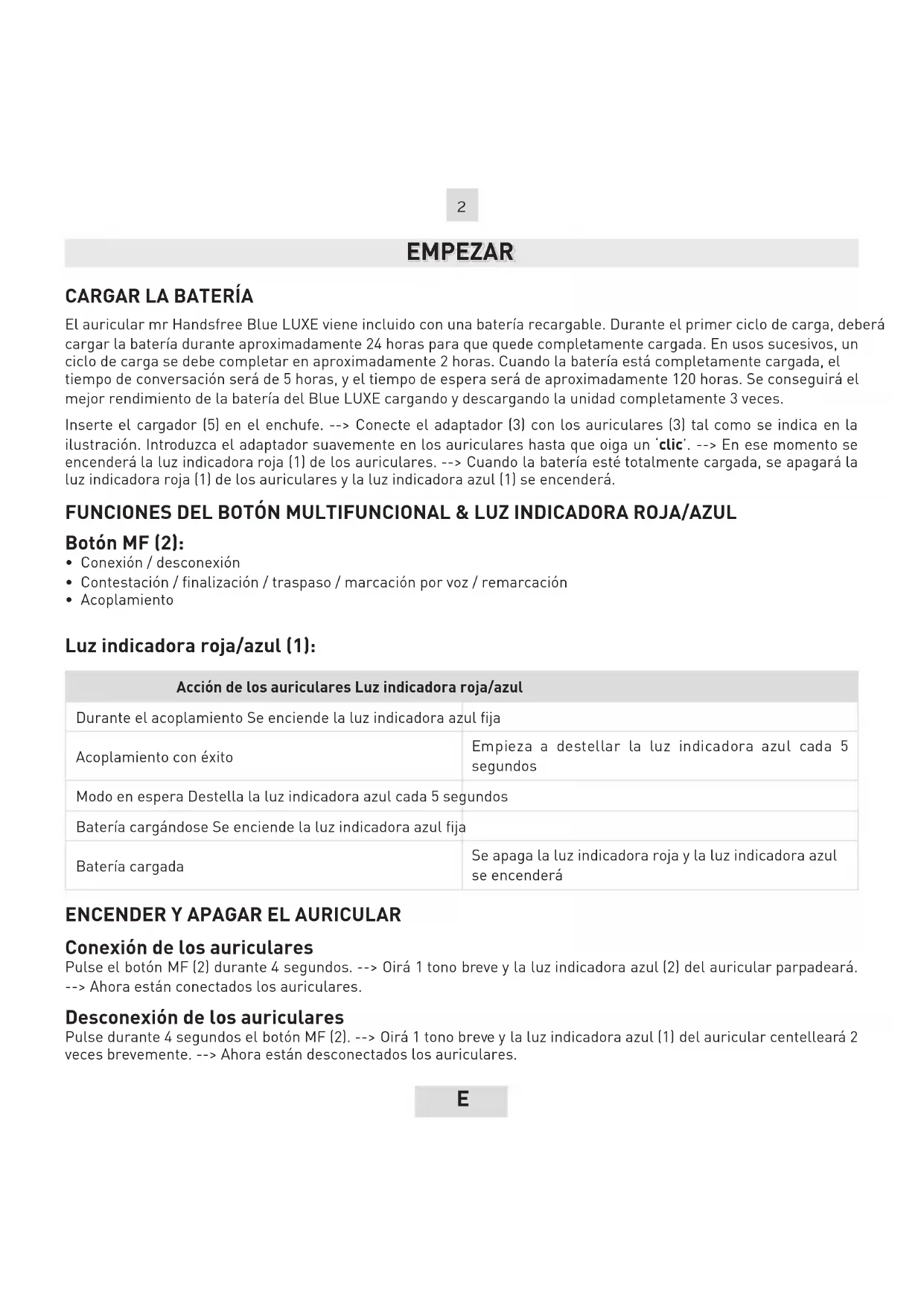 El auricular mr Handsfree Blue LUXE viene incluido con una batería recargable. Durante el primer ciclo de carga, deberá cargar la batería durante aproximadamente 24 horas para que quede completamente cargada. En usos sucesivos, un ciclo de carga se debe completar en aproximadamente 2 horas. Cuando la batería está completamente cargada, el tiempo de conversación será de 5 horas, y el tiempo de espera será de aproximadamente 120 horas. Se conseguirá el mejor rendimiento de la batería del Blue LUXE cargando y descargando la unidad completamente 3 veces. Inserte el cargador (5) en el enchufe. --> Conecte el adaptador (3) con los auriculares (3) tal como se indica en la ilustración. Introduzca el adaptador suavemente en los auriculares hasta que oiga un ‘clic’. --> En ese momento se encenderá la luz indicadora roja (1) de los auriculares. --> Cuando la batería esté totalmente cargada, se apagará la luz indicadora roja (1) de los auriculares y la luz indicadora azul (1) se encenderá. FUNCIONES DEL BOTÓN MULTIFUNCIONAL & LUZ INDICADORA ROJA/AZUL Botón MF (2):