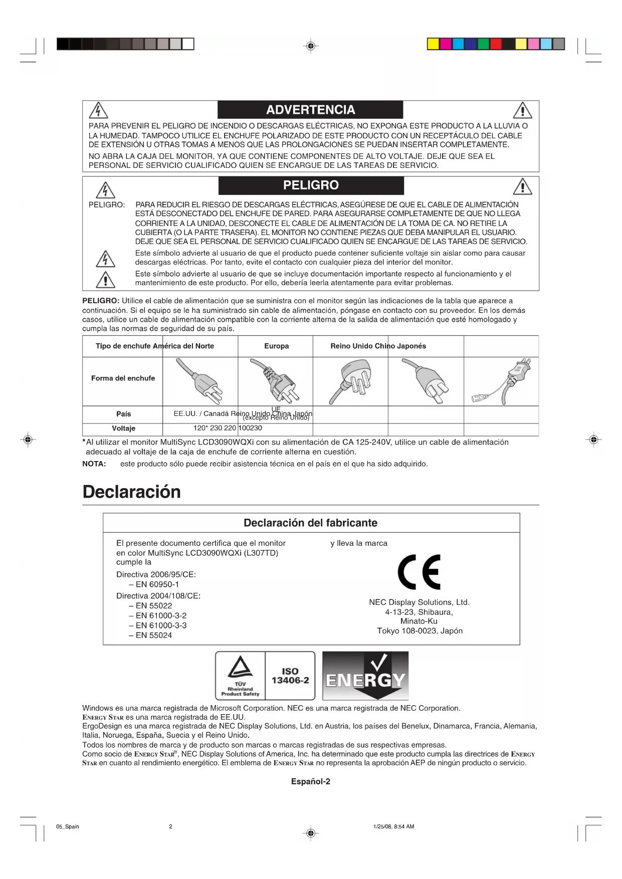 ΟριζντιαΚάθετα04_Greek 1/25/08, 8:54 AM10Español Español-1 Índice Advertencia, Peligro .................................................................................................................... Español-2 Declaración ................................................................................................................................. Español-2 Uso recomendado....................................................................................................................... Español-3 Contenido.................................................................................................................................... Español-5 Inicio rápido................................................................................................................................. Español-6 Controles..................................................................................................................................... Español-10 Apéndice ..................................................................................................................................... Español-15 05_Spain 1/25/08, 8:54 AM1Español-2 ADVERTENCIA PELIGRO PELIGRO: PARA REDUCIR EL RIESGO DE DESCARGAS ELÉCTRICAS, ASEGÚRESE DE QUE EL CABLE DE ALIMENTACIÓN ESTÁ DESCONECTADO DEL ENCHUFE DE PARED. PARA ASEGURARSE COMPLETAMENTE DE QUE NO LLEGA CORRIENTE A LA UNIDAD, DESCONECTE EL CABLE DE ALIMENTACIÓN DE LA TOMA DE CA. NO RETIRE LA CUBIERTA (O LA PARTE TRASERA). EL MONITOR NO CONTIENE PIEZAS QUE DEBA MANIPULAR EL USUARIO. DEJE QUE SEA EL PERSONAL DE SERVICIO CUALIFICADO QUIEN SE ENCARGUE DE LAS TAREAS DE SERVICIO. Este símbolo advierte al usuario de que el producto puede contener suficiente voltaje sin aislar como para causar descargas eléctricas. Por tanto, evite el contacto con cualquier pieza del interior del monitor. Este símbolo advierte al usuario de que se incluye documentación importante respecto al funcionamiento y el mantenimiento de este producto. Por ello, debería leerla atentamente para evitar problemas. PARA PREVENIR EL PELIGRO DE INCENDIO O DESCARGAS ELÉCTRICAS, NO EXPONGA ESTE PRODUCTO A LA LLUVIA O LA HUMEDAD. TAMPOCO UTILICE EL ENCHUFE POLARIZADO DE ESTE PRODUCTO CON UN RECEPTÁCULO DEL CABLE DE EXTENSIÓN U OTRAS TOMAS A MENOS QUE LAS PROLONGACIONES SE PUEDAN INSERTAR COMPLETAMENTE. NO ABRA LA CAJA DEL MONITOR, YA QUE CONTIENE COMPONENTES DE ALTO VOLTAJE. DEJE QUE SEA EL PERSONAL DE SERVICIO CUALIFICADO QUIEN SE ENCARGUE DE LAS TAREAS DE SERVICIO. PELIGRO: Utilice el cable de alimentación que se suministra con el monitor según las indicaciones de la tabla que aparece a continuación. Si el equipo se le ha suministrado sin cable de alimentación, póngase en contacto con su proveedor. En los demás casos, utilice un cable de alimentación compatible con la corriente alterna de la salida de alimentación que esté homologado y cumpla las normas de seguridad de su país. Tipo de enchufe América del NorteEuropaReino Unido Chino JaponésForma del enchufe País VoltajeEE.UU. / Canadá Reino Unido China Japón (excepto Reino Unido)120* 230 220 100230 *Al utilizar el monitor MultiSync LCD3090WQXi con su alimentación de CA 125-240V, utilice un cable de alimentación adecuado al voltaje de la caja de enchufe de corriente alterna en cuestión. NOTA: este producto sólo puede recibir asistencia técnica en el país en el que ha sido adquirido. Declaración Declaración del fabricante El presente documento certifica que el monitor en color MultiSync LCD3090WQXi (L307TD) cumple la Directiva 2006/95/CE: – EN 60950-1 Directiva 2004/108/CE: – EN 55022 – EN 61000-3-2 – EN 61000-3-3 – EN 55024 y lleva la marca NEC Display Solutions, Ltd. 4-13-23, Shibaura, Minato-Ku Tokyo 108-0023, Japón Windows es una marca registrada de Microsoft Corporation. NEC es una marca registrada de NEC Corporation. ENERGY STAR es una marca registrada de EE.UU. ErgoDesign es una marca registrada de NEC Display Solutions, Ltd. en Austria, los países del Benelux, Dinamarca, Francia, Alemania, Italia, Noruega, España, Suecia y el Reino Unido. Todos los nombres de marca y de producto son marcas o marcas registradas de sus respectivas empresas. Como socio de ENERGY STAR