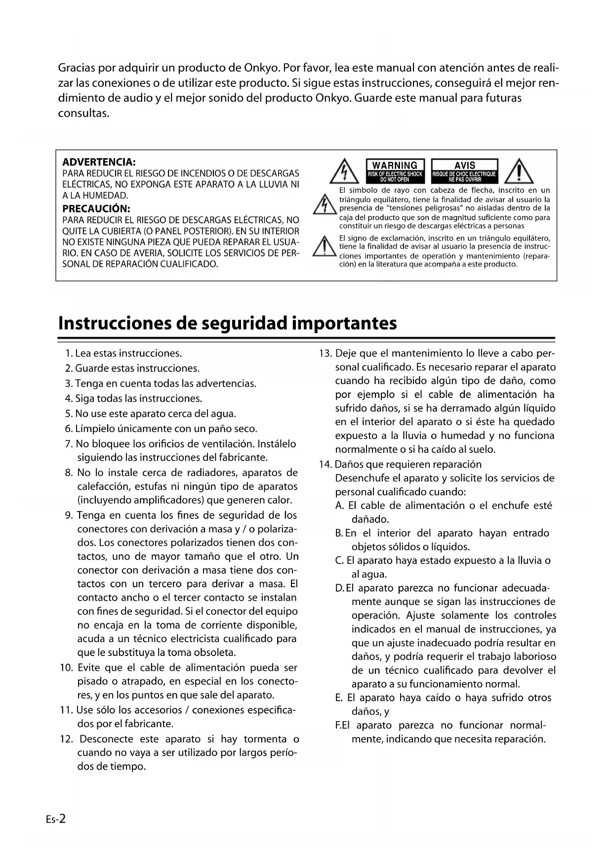 ADVERTENCIA: PARA REDUCIR EL RIESGO DE INCENDIOS O DE DESCARGAS ELÉCTRICAS, NO EXPONGA ESTE APARATO A LA LLUVIA NI A LA HUMEDAD. PRECAUCIÓN: PARA REDUCIR EL RIESGO DE DESCARGAS ELÉCTRICAS, NO QUITE LA CUBIERTA (O PANEL POSTERIOR). EN SU INTERIOR NO EXISTE NINGUNA PIEZA QUE PUEDA REPARAR EL USUA-RIO. EN CASO DE AVERIA, SOLICITE LOS SERVICIOS DE PER-SONAL DE REPARACIÓN CUALIFICADO.El símbolo de rayo con cabeza de flecha, inscrito en un triángulo equilátero, tiene la finalidad de avisar al usuario la presencia de “tensiones peligrosas” no aisladas dentro de la caja del producto que son de magnitud suficiente como para constituir un riesgo de descargas eléctricas a personasEl signo de exclamación, inscrito en un triángulo equilátero, tiene la finalidad de avisar al usuario la presencia de instruc-ciones importantes de operatión y mantenimiento (repara-ción) en la literatura que acompaña a este producto. WARNING RISK OF ELECTRIC SHOCKDO NOT OPENRISQUE DE CHOC ELECTRIQUENE PAS OUVRIR AVISEs-3