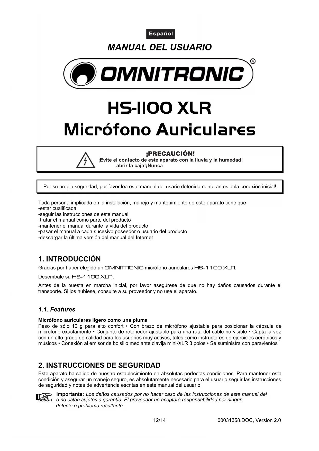 HS-1100 XLR Micrófono Auriculares ¡Evite el contacto de este aparato con la lluvia y la humedad! abrir la caja!¡Nunca ¡PRECAUCIÓN! Por su propia seguridad, por favor lea este manual del usario detenidamente antes dela conexión inicial! Toda persona implicada en la instalación, manejo y mantenimiento de este aparato tiene que-estar cualificada-seguir las instrucciones de este manual-tratar el manual como parte del producto-mantener el manual durante la vida del producto-pasar el manual a cada sucesivo poseedor o usuario del producto-descargar la última versión del manual del Internet