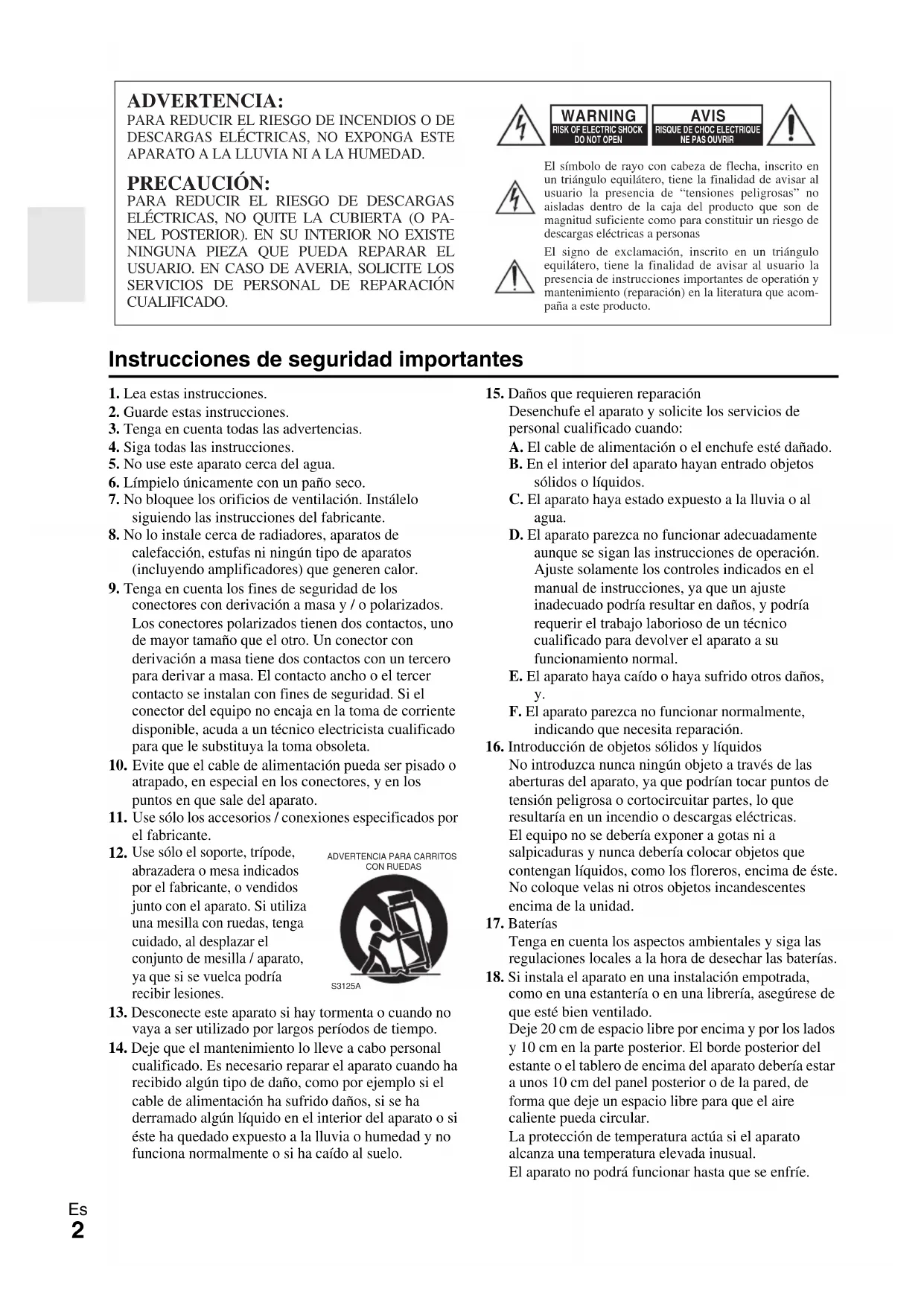 WARNING RISK OF ELECTRIC SHOCKDO NOT OPENRISQUE DE CHOC ELECTRIQUENE PAS OUVRIR AVIS ADVERTENCIA PARA CARRITOS CON RUEDAS S3125A3