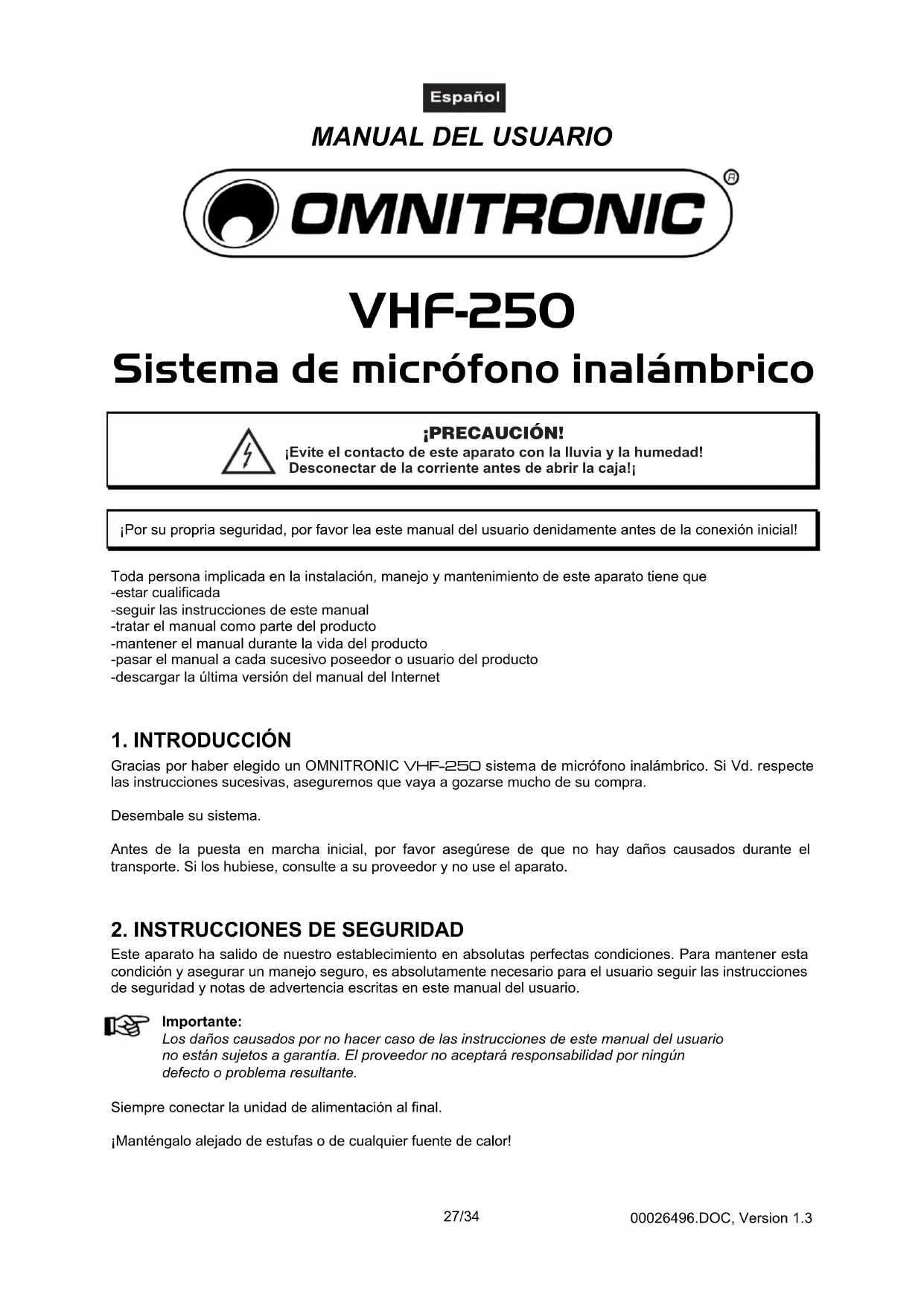 Gracias por haber elegido un OMNITRONIC VHF-250 sistema de micrófono inalámbrico. Si Vd. respecte las instrucciones sucesivas, aseguremos que vaya a gozarse mucho de su compra.Desembale su sistema.Antes de la puesta en marcha inicial, por favor asegúrese de que no hay daños causados durante eltransporte. Si los hubiese, consulte a su proveedor y no use el aparato.