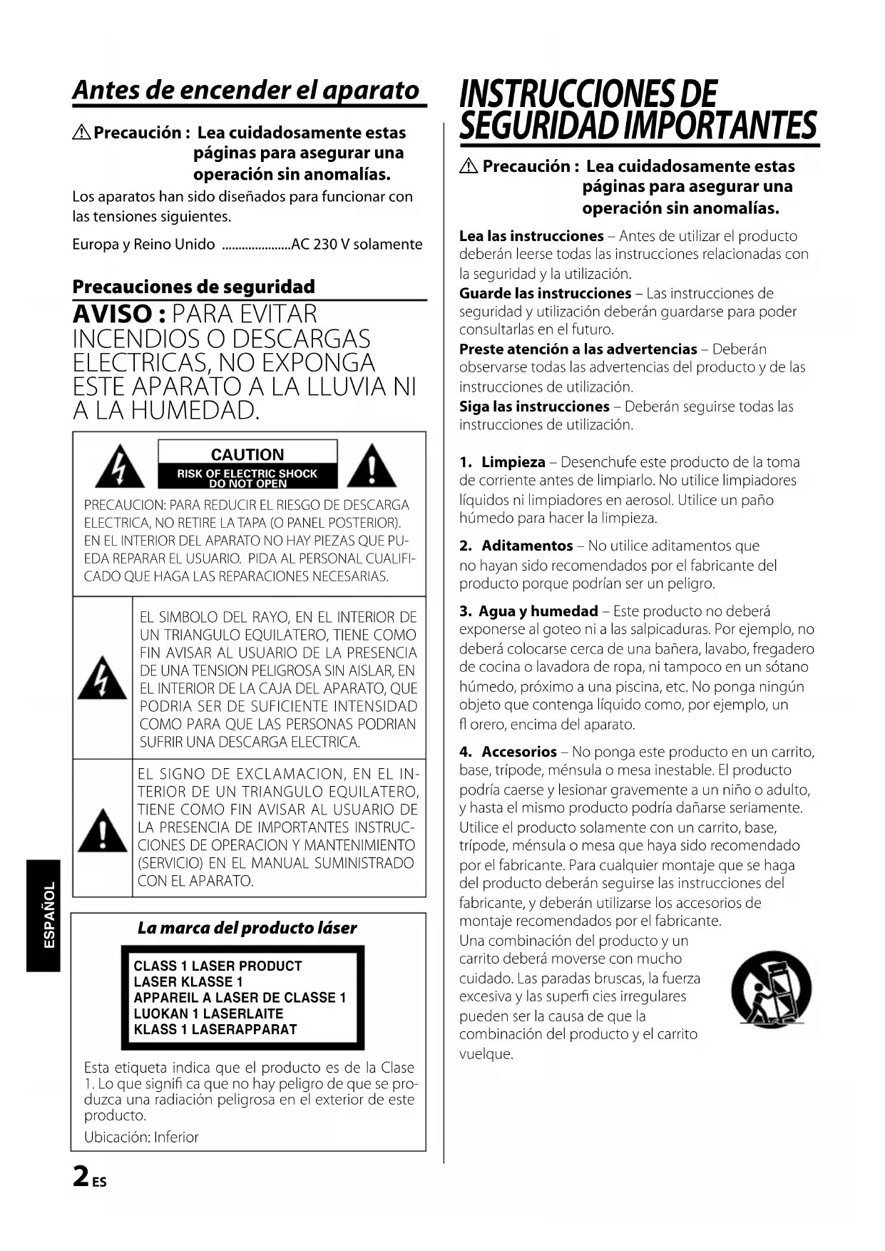 Precaución : Lea cuidadosamente estas páginas para asegurar una operación sin anomalías.Lea las instrucciones – Antes de utilizar el producto deberán leerse todas las instrucciones relacionadas con la seguridad y la utilización.Guarde las instrucciones – Las instrucciones de seguridad y utilización deberán guardarse para poder consultarlas en el futuro.Preste atención a las advertencias – Deberán observarse todas las advertencias del producto y de las instrucciones de utilización.Siga las instrucciones – Deberán seguirse todas las instrucciones de utilización.1. Limpieza – Desenchufe este producto de la toma de corriente antes de limpiarlo. No utilice limpiadores líquidos ni limpiadores en aerosol. Utilice un paño húmedo para hacer la limpieza.2. Aditamentos – No utilice aditamentos que no hayan sido recomendados por el fabricante del producto porque podrían ser un peligro.3. Agua y humedad – Este producto no deberá exponerse al goteo ni a las salpicaduras. Por ejemplo, no deberá colocarse cerca de una bañera, lavabo, fregadero de cocina o lavadora de ropa, ni tampoco en un sótano húmedo, próximo a una piscina, etc. No ponga ningún objeto que contenga líquido como, por ejemplo, un orero, encima del aparato.4. Accesorios – No ponga este producto en un carrito, base, trípode, ménsula o mesa inestable. El producto podría caerse y lesionar gravemente a un niño o adulto, y hasta el mismo producto podría dañarse seriamente. Utilice el producto solamente con un carrito, base, trípode, ménsula o mesa que haya sido recomendado por el fabricante. Para cualquier montaje que se haga del producto deberán seguirse las instrucciones del fabricante, y deberán utilizarse los accesorios de montaje recomendados por el fabricante.Una combinación del producto y un carrito deberá moverse con mucho cuidado. Las paradas bruscas, la fuerza excesiva y las super cies irregulares pueden ser la causa de que la combinación del producto y el carrito vuelque.CAUTIONRISK OF ELECTRIC SHOCKDO NOT OPEN PRECAUCION: PARA REDUCIR EL RIESGO DE DESCARGA ELECTRICA, NO RETIRE LA TAPA (O PANEL POSTERIOR).