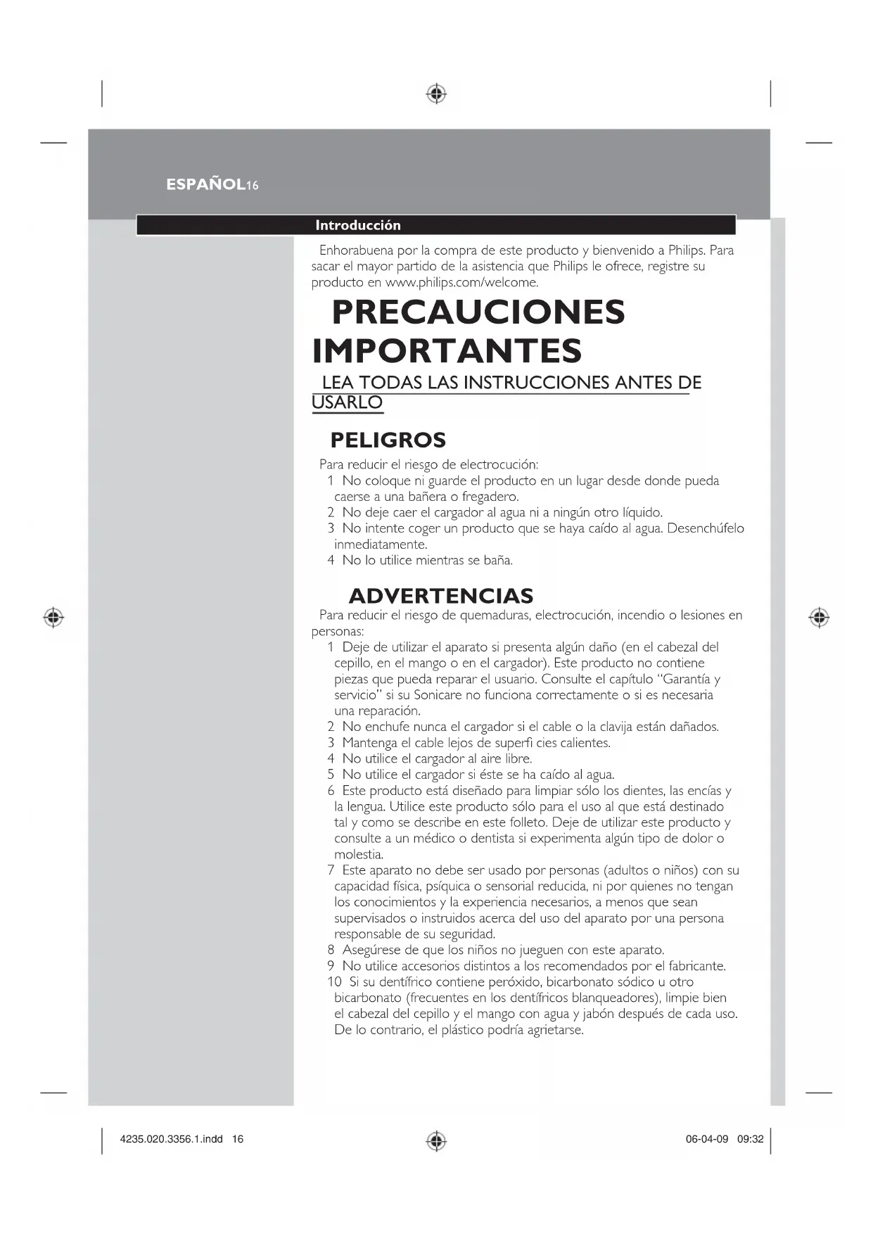 4235.020.3356.1.indd 164235.020.3356.1.indd 16 06-04-09 09:3206-04-09 09:3211 Para evitar que el producto se deteriore, no lave el cabezal del cepillo,
