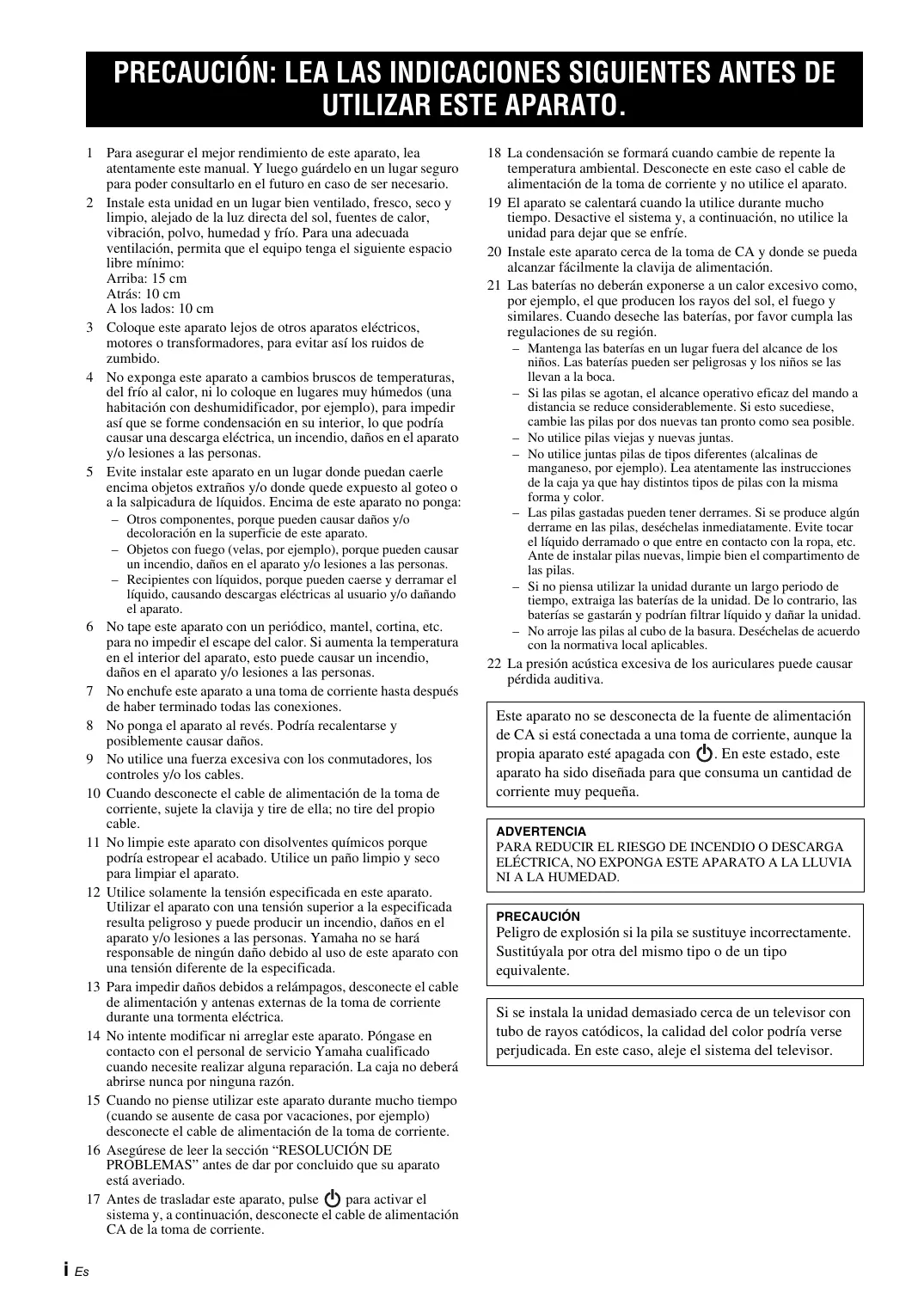 PRECAUCIÓN: LEA LAS INDICACIONES SIGUIENTES ANTES DE UTILIZAR ESTE APARATO. 1 Para asegurar el mejor rendimiento de este aparato, lea atentamente este manual. Y luego guárdelo en un lugar seguro para poder consultarlo en el futuro en caso de ser necesario. 2 Instale esta unidad en un lugar bien ventilado, fresco, seco y limpio, alejado de la luz directa del sol, fuentes de calor, vibración, polvo, humedad y frío. Para una adecuada ventilación, permita que el equipo tenga el siguiente espacio libre mínimo: Arriba: 15 cm Atrás: 10 cm A los lados: 10 cm 3 Coloque este aparato lejos de otros aparatos eléctricos, motores o transformadores, para evitar así los ruidos de zumbido. 4 No exponga este aparato a cambios bruscos de temperaturas, del frío al calor, ni lo coloque en lugares muy húmedos (una habitación con deshumidificador, por ejemplo), para impedir así que se forme condensación en su interior, lo que podría causar una descarga eléctrica, un incendio, daños en el aparato y/o lesiones a las personas. 5 Evite instalar este aparato en un lugar donde puedan caerle encima objetos extraños y/o donde quede expuesto al goteo o a la salpicadura de líquidos. Encima de este aparato no ponga: – Otros componentes, porque pueden causar daños y/o decoloración en la superficie de este aparato. – Objetos con fuego (velas, por ejemplo), porque pueden causar un incendio, daños en el aparato y/o lesiones a las personas. – Recipientes con líquidos, porque pueden caerse y derramar el líquido, causando descargas eléctricas al usuario y/o dañando el aparato. 6 No tape este aparato con un periódico, mantel, cortina, etc. para no impedir el escape del calor. Si aumenta la temperatura en el interior del aparato, esto puede causar un incendio, daños en el aparato y/o lesiones a las personas. 7 No enchufe este aparato a una toma de corriente hasta después de haber terminado todas las conexiones. 8 No ponga el aparato al revés. Podría recalentarse y posiblemente causar daños. 9 No utilice una fuerza excesiva con los conmutadores, los controles y/o los cables. 10 Cuando desconecte el cable de alimentación de la toma de corriente, sujete la clavija y tire de ella; no tire del propio cable. 11 No limpie este aparato con disolventes químicos porque podría estropear el acabado. Utilice un paño limpio y seco para limpiar el aparato. 12 Utilice solamente la tensión especificada en este aparato. Utilizar el aparato con una tensión superior a la especificada resulta peligroso y puede producir un incendio, daños en el aparato y/o lesiones a las personas. Yamaha no se hará responsable de ningún daño debido al uso de este aparato con una tensión diferente de la especificada. 13 Para impedir daños debidos a relámpagos, desconecte el cable de alimentación y antenas externas de la toma de corriente durante una tormenta eléctrica. 14 No intente modificar ni arreglar este aparato. Póngase en contacto con el personal de servicio Yamaha cualificado cuando necesite realizar alguna reparación. La caja no deberá abrirse nunca por ninguna razón. 15 Cuando no piense utilizar este aparato durante mucho tiempo (cuando se ausente de casa por vacaciones, por ejemplo) desconecte el cable de alimentación de la toma de corriente. 16 Asegúrese de leer la sección “RESOLUCIÓN DE PROBLEMAS” antes de dar por concluido que su aparato está averiado. 17 Antes de trasladar este aparato, pulse para activar el sistema y, a continuación, desconecte el cable de alimentación CA de la toma de corriente. i Es 18 La condensación se formará cuando cambie de repente la temperatura ambiental. Desconecte en este caso el cable de alimentación de la toma de corriente y no utilice el aparato. 19 El aparato se calentará cuando la utilice durante mucho tiempo. Desactive el sistema y, a continuación, no utilice la unidad para dejar que se enfríe. 20 Instale este aparato cerca de la toma de CA y donde se pueda alcanzar fácilmente la clavija de alimentación. 21 Las baterías no deberán exponerse a un calor excesivo como, por ejemplo, el que producen los rayos del sol, el fuego y similares. Cuando deseche las baterías, por favor cumpla las regulaciones de su región. – Mantenga las baterías en un lugar fuera del alcance de los niños. Las baterías pueden ser peligrosas y los niños se las llevan a la boca. – Si las pilas se agotan, el alcance operativo eficaz del mando a distancia se reduce considerablemente. Si esto sucediese, cambie las pilas por dos nuevas tan pronto como sea posible. – No utilice pilas viejas y nuevas juntas. – No utilice juntas pilas de tipos diferentes (alcalinas de manganeso, por ejemplo). Lea atentamente las instrucciones de la caja ya que hay distintos tipos de pilas con la misma forma y color. – Las pilas gastadas pueden tener derrames. Si se produce algún derrame en las pilas, deséchelas inmediatamente. Evite tocar el líquido derramado o que entre en contacto con la ropa, etc. Ante de instalar pilas nuevas, limpie bien el compartimento de las pilas. – Si no piensa utilizar la unidad durante un largo periodo de tiempo, extraiga las baterías de la unidad. De lo contrario, las baterías se gastarán y podrían filtrar líquido y dañar la unidad. – No arroje las pilas al cubo de la basura. Deséchelas de acuerdo con la normativa local aplicables. 22 La presión acústica excesiva de los auriculares puede causar pérdida auditiva. Este aparato no se desconecta de la fuente de alimentación de CA si está conectada a una toma de corriente, aunque la propia aparato esté apagada con . En este estado, este aparato ha sido diseñada para que consuma un cantidad de corriente muy pequeña. ADVERTENCIA PARA REDUCIR EL RIESGO DE INCENDIO O DESCARGA ELÉCTRICA, NO EXPONGA ESTE APARATO A LA LLUVIA NI A LA HUMEDAD. PRECAUCIÓN Peligro de explosión si la pila se sustituye incorrectamente. Sustitúyala por otra del mismo tipo o de un tipo equivalente. Si se instala l