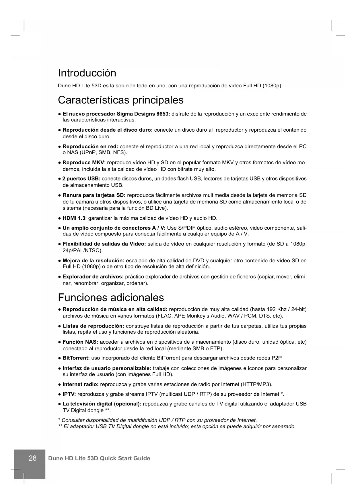 tornillos que la sujetan. Obtener acceso a unidades de red Para conectar una unidad de red mediante SMB o protocolo NFS, asegúrese de que está en la pantalla principal del menú del reproductor, pulse el botón “MENU” del mando a distancia, y seleccione “Crear car- peta de red”, y luego confi gure los parámetros de red. El reproductor mostrará un icono que corresponde a la unidad de red en la pantalla principal. Para examinar la lista de la red utilice “Network Browser” para acceder a SMB o protocolos UPnP. NOTA: Si algunas características de la red no se muestran en el reproductor, puede que tenga que esperar unos minutos y vuelva a intentar (o pulse la tecla “MENU” del Mando a distancia y elija la opción “Actualizar”). Formatear el disco duro Para formatear un disco duro conectado al reproductor, seleccione la unidad en la pantalla principal del menú del reproductor, pulse la tecla “INFO” del Mando a distancia y elija la opción “Formato de disco” (Para dar formato al disco entero) o “Formato de partición” (o formato a una partición de disco ya existen- tes solamente). El reproductor formateara el disco con el sistema de archivos “EXT2”. NOTA: Para utilizar discos formateados por el reproductor en un PC con Windows, es posible que tenga que instalar algún software en el PC, como “Ext2fsd” (http://www.ext2fsd.com/).33 Español Encendido y apagado del reproductor Para poner el reproductor en el modo standby, pulse la tecla «Power» del Mando a distancia o el «botón on / off» en el panel frontal. Para salir del modo de espera, pulse cualquiera de estos botones de nuevo. Dependiendo de la confi guración del reproductor (ver el menú de confi guración del reproductor), se puede utilizar “Stanby de hardware” o un “Stanby de software”. En el «modo» de espera del hardware, casi se completa el apagado el reproductor consume muy poca energía. En el «modo» de espera del software, el reproductor no produce ninguna señal en la salida de vídeo, pero todavía está funcionando. Por ejemplo, si usted tiene algunos dispositivos de almacenamiento conectados al reproductor, es posible acceder a ellas desde la red («la función NAS» del reproductor). Para salir del modo de espera del «software» el repro- ductor sólo tarda unos segundos. Cuando el reproductor está en el «modo» de espera del software, sigue consumiendo energía signifi cativa. No se recomienda para mantener el reproductor en el modo de espera de software durante mucho tiempo si no lo necesita. NOTA: Después de apagar el reproductor o dejando al reproductor en modo de espera de hardware, se recomienda esperar aproximadamente 1 minuto antes de encenderlo de nuevo. NAS (Network Attached Storage) Puede acceder a dispositivos de almacenamiento conectados al reproductor desde la red local a través de FTP y SMB protocolos. En un PC con Windows, simplemente escriba “ftp://ip_address” o “\ \ direc- ción_ip” en el explorador de Windows, donde “dirección IP” es la dirección IP del reproductor. WiFi Usted puede usar un adaptador USB WiFi para conectar el reproductor a la red local a través de WiFi. Consulte aquí para obtener la información sobre el soporte de adaptadores USB WiFi: http://dune-hd.com/support/hw_compat/ Limitaciones La compatibilidad del reproductor con un hardware especial (equipo A / V, equipos de red, unidades de disco, etc) puede depender de varios factores (Modelo de hardware, detalles de instalación del hardware y uso, la confi guración del reproductor y el hardware, etc). Si el reproductor no funciona correctamente con un hardware en particular, tratar de ajustar la confi guración del reproductor o del hardware, trate de usar el hardware de una manera diferente, o tratar de utilizar algún otro hardware. La compatibilidad del reproductor con un contenido determinados (archivos, discos, etc) puede depender de varios factores (características específi cas de los archivos, requisitos específi cos de la confi guración del reproductor, etc). Si el reproductor no puede reproducir correctamente un contenido de determinado, trate de ajustar la confi guración del reproductor, o trate de usar el contenido con una codifi cación diferen- te. Actualización de su reproductor Por favor, pinche aquí para obtener versiones actualizadas del fi rmware del reproductor (puede mejorar el funcionamiento del reproductor y ampliar sus posibilidades): http://dune-hd.com/fi rmware/ (NOTA: También puede conectar el reproductor a Internet y utilizar la función de actualización del fi rmware en línea, consulte Confi guración / Varios / actualización de fi rmware.) Por favor, consulte aquí para obtener más detalles y la documentación actualizada e información sobre uso del reproductor: http://dune-hd.com/manuals/ http://dune-hd.com/support/34 Dune HD Lite 53D Quick Start Guide Introduzione Dune HD Lite 53D è una soluzione tutto-in-uno per la riproduzione di video Full HD (1080p). Caratteristiche principali ● Il nuovo processore Sigma Designs 8653: godrai di un’eccellente riproduzione e ottime performance nelle caratteristiche interattive. ● HDD player: connetti un HDD al player e riproduci i contenuti direttamente dall’HDD. ● Network player: connetti il player alla rete locale e riproduci i contenuti direttamente dal PC o NAS (UPnP, SMB, NFS). ● MKV player: riproduci video HD e SD nel popolare formato MKV e altri moderni formati, inclusi i video HD migliori con altissimo bitrate. ● 2 porte USB: connetti facilmente HDD, USB flash drive, USB card reader e altri dispositivi di memoriz- zazione USB. ● Slot per schede SD: riproduci facilmente i file sulla memory card SD dalla tua fotocamera o altre peri- feriche o usa la memoria SD come disco locale o di sistema. ● HDMI 1.3: assicura la qualità migliore possibile per HD video e HD audio. ● Un set ricco di connettori A/V standard: S/PDIF audio ottico, audio stereo, video compon
