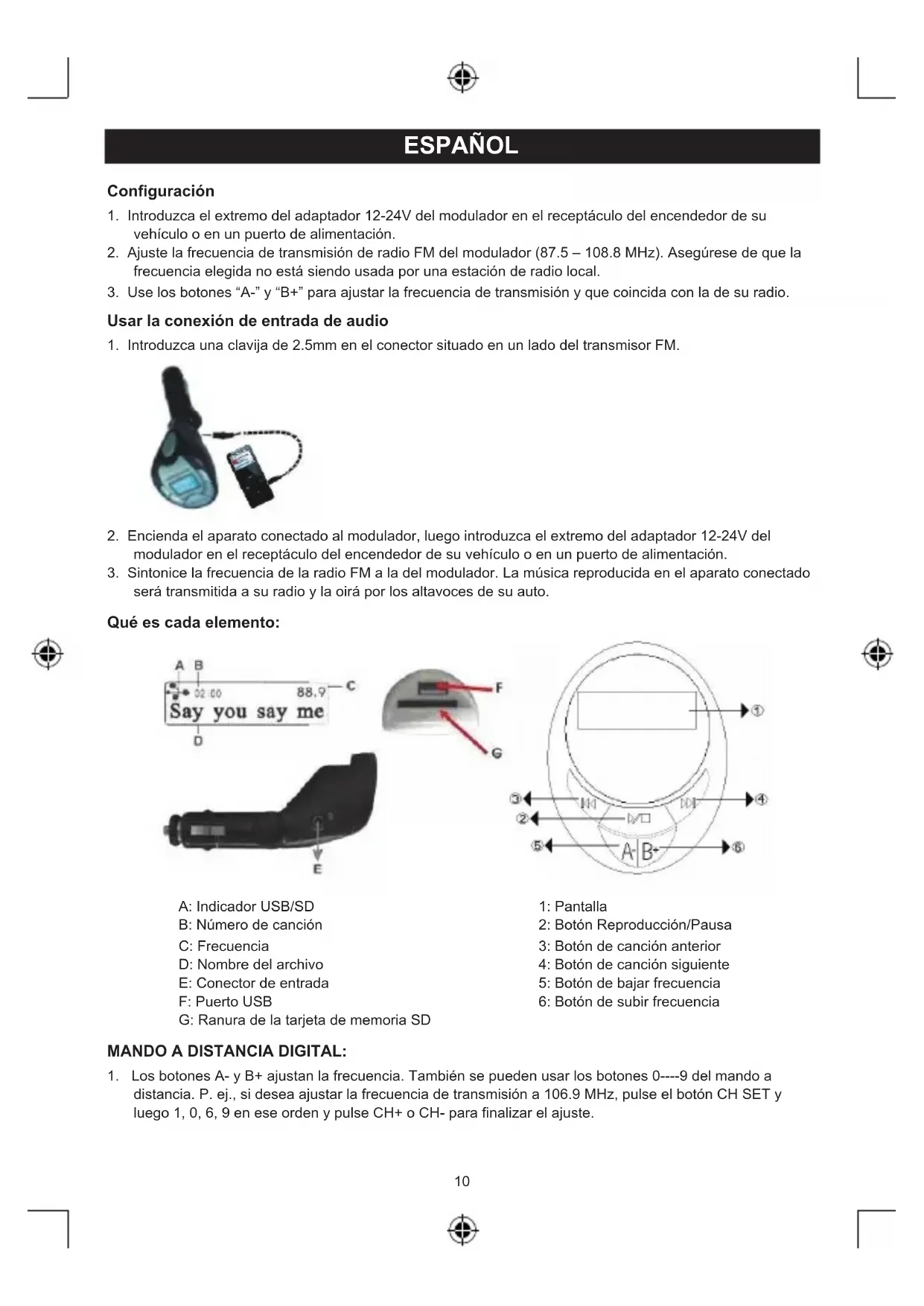 será transmitida a su radio y la oirá por los altavoces de su auto. Qué es cada elemento: A: Indicador USB/SD B: Número de canción C: Frecuencia D: Nombre del archivo E: Conector de entrada F: Puerto USB G: Ranura de la tarjeta de memoria SD 1: Pantalla 2: Botón Reproducción/Pausa 3: Botón de canción anterior 4: Botón de canción siguiente 5: Botón de bajar frecuencia 6: Botón de subir frecuencia MANDO A DISTANCIA DIGITAL: