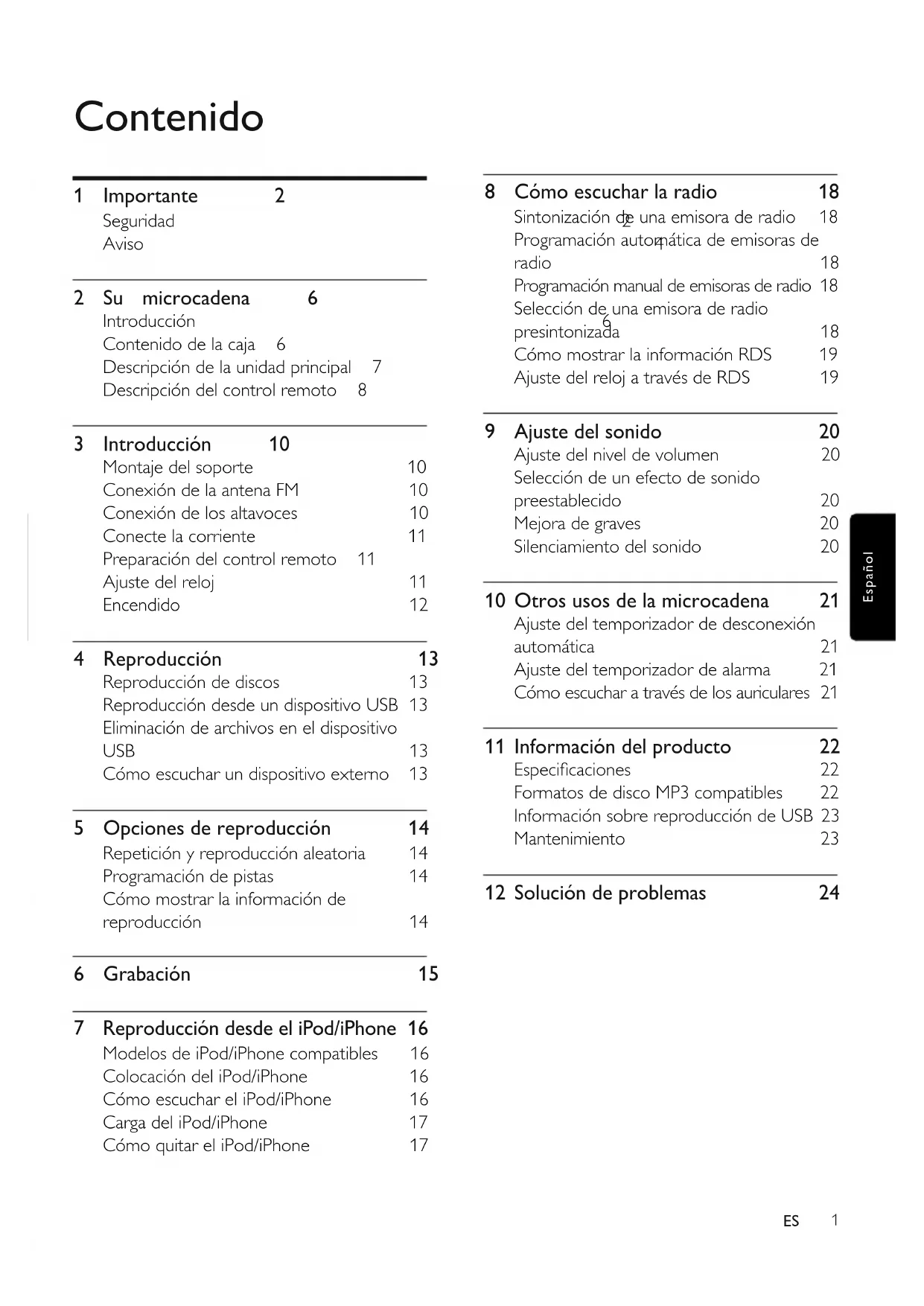 Para que la garantía mantenga su validez, no trate nunca de reparar el Sistema usted本身就是. Si tiene problemas al usar este aparato, disfruebe los siguientes puntos antes de llamar al servicios técnico. Si no consigue resolver el problema, vaya al sitio Web de Philips (www.philips.com/support). Cuando seonga en contacto con Philips, asegúrese de que el dispositivo está cerca y de tener a mano el número de modelos y el número de série.