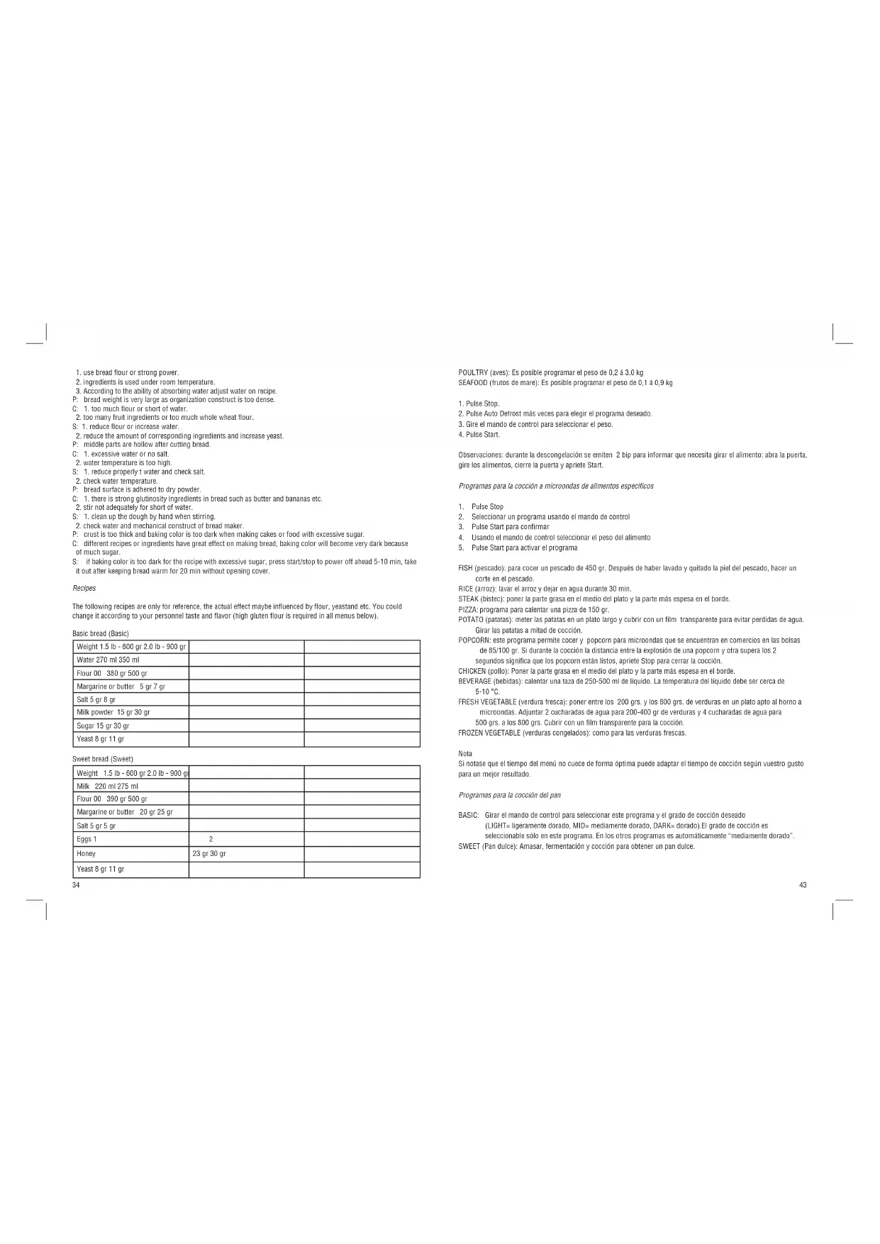 FISH (pescado): para cocer un pescado de 450 gr. Después de haber lavado y quitado la piel del pescado, hacer un corte en el pescado. RICE (arroz): lavar el arroz y dejar en agua durante 30 min. STEAK (bistec): poner la parte grasa en el medio del plato y la parte más espesa en el borde. PIZZA: programa para calentar una pizza de 150 gr. POTATO (patatas): meter las patatas en un plato largo y cubrir con un lm transparente para evitar perdidas de agua. Girar las patatas a mitad de cocción. POPCORN: este programa permite cocer y popcorn para microondas que se encuentran en comercios en las bolsas de 85/100 gr. Si durante la cocción la distancia entre la explosión de una popcorn y otra supera los 2 segundos signica que los popcorn están listos, apriete Stop para cerrar la cocción. CHICKEN (pollo): Poner la parte grasa en el medio del plato y la parte más espesa en el borde. BEVERAGE (bebidas): calentar una taza de 250-500 ml de líquido. La temperatura del líquido debe ser cerca de 5-10 °C. FRESH VEGETABLE (verdura fresca): poner entre los 200 grs. y los 800 grs. de verduras en un plato apto al horno a microondas. Adjuntar 2 cucharadas de agua para 200-400 gr de verduras y 4 cucharadas de agua para 500 grs. a los 800 grs. Cubrir con un lm transparente para la cocción. FROZEN VEGETABLE (verduras congelados): como para las verduras frescas. Nota Si notase que el tiempo del menú no cuece de forma óptima puede adaptar el tiempo de cocción según vuestro gusto para un mejor resultado. Programas para la cocción del pan BASIC: Girar el mando de control para seleccionar este programa y el grado de cocción deseado (LIGHT= ligeramente dorado, MID= mediamente dorado, DARK= dorado).El grado de cocción es seleccionable sólo en este programa. En los otros programas es automáticamente “mediamente dorado”. SWEET (Pan dulce): Amasar, fermentación y cocción para obtener un pan dulce.French bread (French) Weight 1.5 lb - 600 gr 2.0 lb - 900 gr Water 200 ml 300 ml Flour 00 240 gr 360 gr Flour 0 130 gr 190 gr Salt 8 gr 12 gr Oil 12 gr 18 gr Sugar 5 gr 10 gr Yeast 8 gr 11 gr Whole wheatbread (Whole wheatbread) Weight 1.5 lb - 600 gr 2.0 lb - 900 gr Water 270 ml 350 ml Flour of integral wheat 410 gr 540 gr Honey 5 gr 5 gr Salt 5 gr 5 gr Yeast 8 gr 11 gr Quick bread (Quick) Weight 1.5 lb - 600 gr 2.0 lb - 900 gr Water 280 ml 375 ml Flour 00 390 gr 525 gr Flour 0 50 gr 75 gr Salt 5 gr 5 gr Oil 11 gr 15 gr Sugar 5 gr 5 gr Yeast 8 gr 11 gr Dough for pizza (Dough) Weight 1.5 lb - 600 gr 2.0 lb - 900 gr Water 180 ml 265 ml Flour 00 230 gr 350 gr Regrinded semolina 155 gr 230 gr Salt 5 gr 5 gr Oil 15 gr 17 gr Sugar 15 gr 17 gr Yeast 9 gr 12 gr