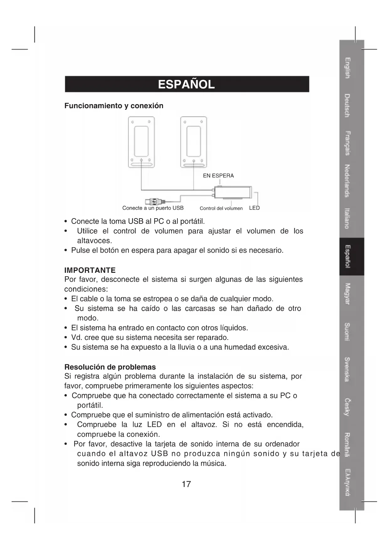 - Por favor, desactive la tarjeta de sonido interna de su ordenador cuando el altavoz USB no produzca ningún sonido y su tarjeta de sonido interna siga reproduciendo la música.18 Declaración de conformidad La empresa infraescrita, Nedis B.V. De Tweeling 28 5215MC ’s-Hertogenbosch Países Bajos Tel.: 0031 73 599 1055 Email: info@nedis.com Declara que el producto: Marca: König Electronic Modelo: CMP-SPUSB30 Descripción: EQUIPO DE ALTAVOCES 2.0 USB 2*5W se encuentra conforme a las siguientes normas: EN55022: 1998 + A1: 2000 + A2: 2003 EN55024: 1998 + A1: 2001 + A2: 2003 EN61000-3-2: 2006 EN61000-3-3: 1995 + A1: 2001 + A2: 2005 Y cumple con todos los requisitos de las directivas de la Unión Europea 2004/108/EC ‘s-Hertogenbosch, 25-03-09 D. J. Gilad Director de compras19 Medidas de seguridad: No exponga el producto al agua ni a la humedad. Mantenimiento: Limpiar exclusivamente con un paño seco. No utilice disolventes ni productos de limpieza agresivos. Garantía: No se aceptará ninguna garantía o responsabilidad derivada de cualquier cambio o modificaciones realizadas al producto o daños provocados por un uso incorrecto del presente producto. General: Las ilustraciones y las especificaciones podrán sufrir cambios sin previo aviso. Todas las marcas de los logotipos y los nombres de productos constituyen patentes o marcas registradas de sus titulares correspondientes, reconocidos como tal. Conserve este manual para acudir a él posteriormente. Cuidado: Este producto está señalizado con este símbolo. Esto significa que los productos eléctricos y electrónicos gastados no deberán mezclarse con los desechos domésticos generales. Existen distintos sistemas de recogida individuales para este tipo de productos. Copyright ©20 MAGYAR NYELVŰ Kezelés és csatlakoztatás: Csatlakoztatás USB portra Készenlét Hangerő szabályozása LED