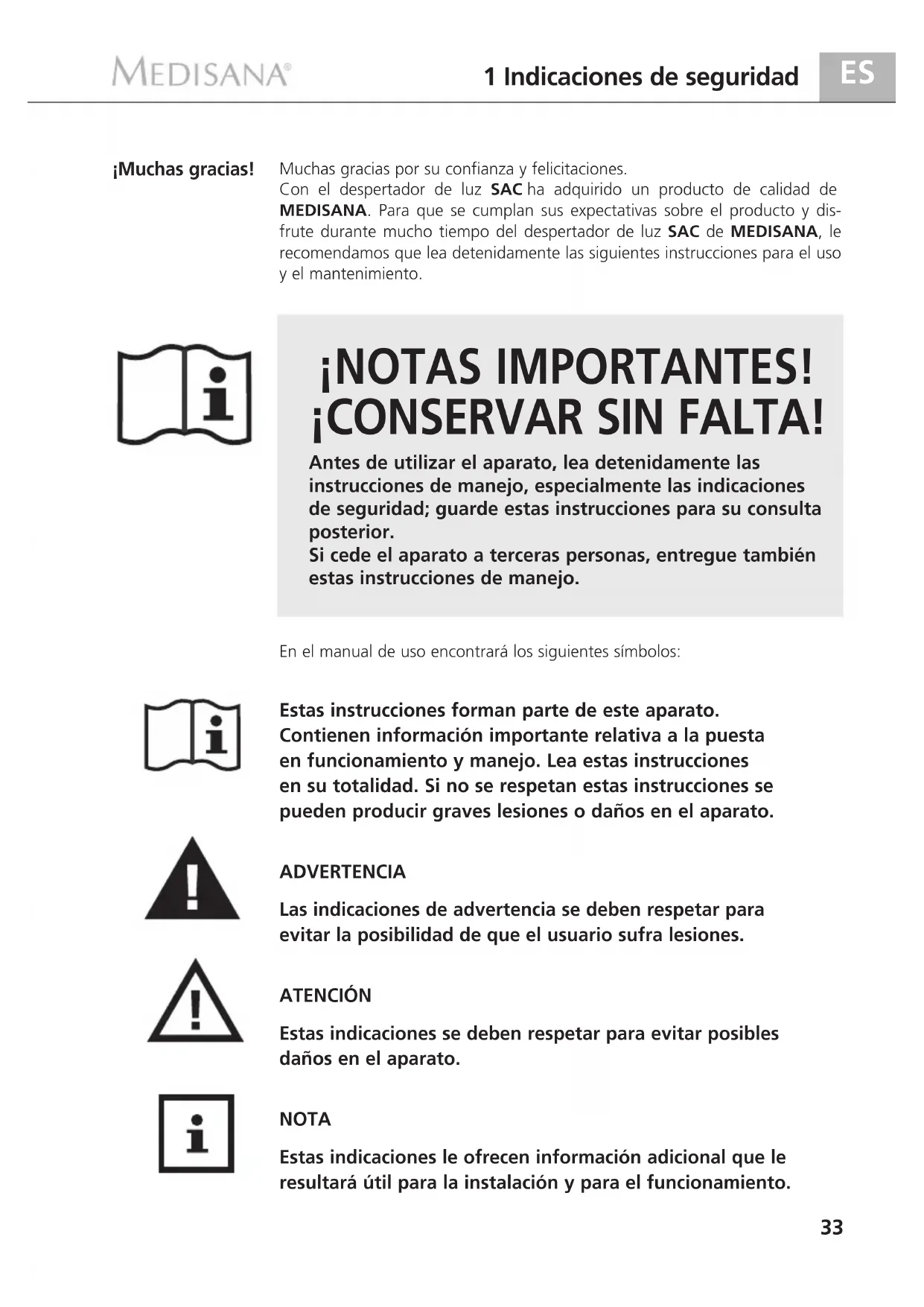 Muchas gracias! Muchas gracias por su confianza y felicitaciones.Con el despertador de luz SAC ha adquirido un producto de calidad deMEDISANA. Para que se cumplan sus expectativas sobre el producto y dis- frute durante mucho tiempo del despertador de luz SAC de MEDISANA, le recomendamos que lea detenidamente las siguientes instrucciones para el usoy el mantenimiento. ¡NOTAS IMPORTANTES! ¡CONSERVAR SIN FALTA! Antes de utilizar el aparato, lea detenidamente las instrucciones de manejo, especialmente las indicaciones de seguridad; guarde estas instrucciones para su consulta posterior. Si cede el aparato a terceras personas, entregue también estas instrucciones de manejo. En el manual de uso encontrará los siguientes símbolos: Estas instrucciones forman parte de este aparato. Contienen información importante relativa a la puesta en funcionamiento y manejo. Lea estas instrucciones en su totalidad. Si no se respetan estas instrucciones se pueden producir graves lesiones o daños en el aparato. ADVERTENCIA Las indicaciones de advertencia se deben respetar para evitar la posibilidad de que el usuario sufra lesiones. ATENCIÓN Estas indicaciones se deben respetar para evitar posibles daños en el aparato. NOTA Estas indicaciones le ofrecen información adicional que le resultará útil para la instalación y para el funcionamiento. GA_SAC_West_Final_neu.qxd:Lichtwecker 15.10.2008 12:17 Uhr Seite 3334 1 Indicaciones de seguridad / 2 Funcionamiento