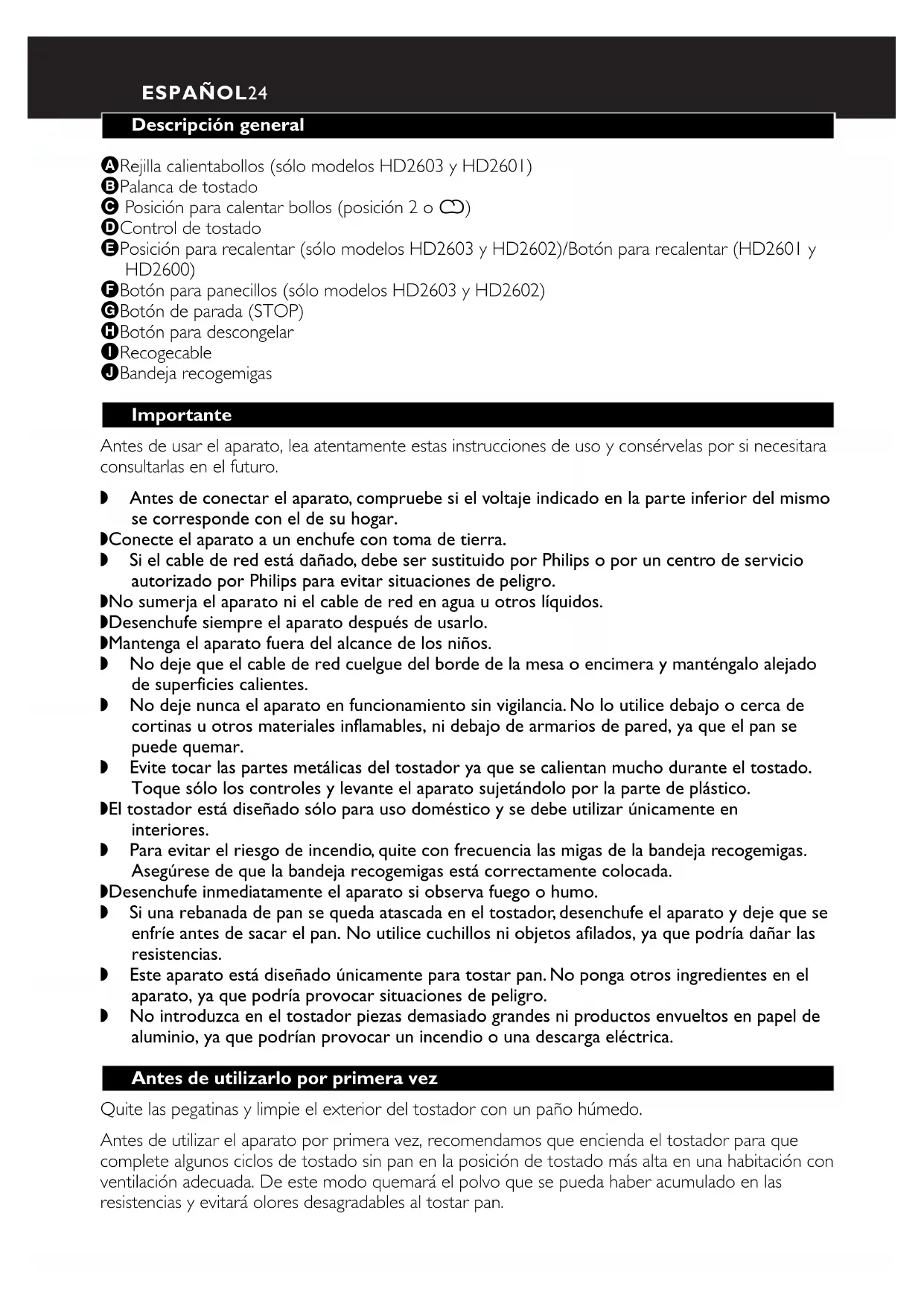 roosterproces onderbreken? RoosterenESPAÑOL24 Descripción general A Rejilla calientabollos (sólo modelos HD2603 y HD2601) B Palanca de tostado C Posición para calentar bollos (posición 2 o ¬) D Control de tostado E Posición para recalentar (sólo modelos HD2603 y HD2602)/Botón para recalentar (HD2601 y HD2600) F Botón para panecillos (sólo modelos HD2603 y HD2602) G Botón de parada (STOP) H Botón para descongelar I Recogecable J Bandeja recogemigas Importante Antes de usar el aparato, lea atentamente estas instrucciones de uso y consérvelas por si necesitara consultarlas en el futuro. ◗ Antes de conectar el aparato, compruebe si el voltaje indicado en la parte inferior del mismo se corresponde con el de su hogar. ◗ Conecte el aparato a un enchufe con toma de tierra. ◗ Si el cable de red está dañado, debe ser sustituido por Philips o por un centro de servicio autorizado por Philips para evitar situaciones de peligro. ◗ No sumerja el aparato ni el cable de red en agua u otros líquidos. ◗ Desenchufe siempre el aparato después de usarlo. ◗ Mantenga el aparato fuera del alcance de los niños. ◗ No deje que el cable de red cuelgue del borde de la mesa o encimera y manténgalo alejado de superficies calientes. ◗ No deje nunca el aparato en funcionamiento sin vigilancia. No lo utilice debajo o cerca de cortinas u otros materiales inflamables, ni debajo de armarios de pared, ya que el pan se puede quemar. ◗ Evite tocar las partes metálicas del tostador ya que se calientan mucho durante el tostado. Toque sólo los controles y levante el aparato sujetándolo por la parte de plástico. ◗ El tostador está diseñado sólo para uso doméstico y se debe utilizar únicamente en interiores. ◗ Para evitar el riesgo de incendio, quite con frecuencia las migas de la bandeja recogemigas. Asegúrese de que la bandeja recogemigas está correctamente colocada. ◗ Desenchufe inmediatamente el aparato si observa fuego o humo. ◗ Si una rebanada de pan se queda atascada en el tostador, desenchufe el aparato y deje que se enfríe antes de sacar el pan. No utilice cuchillos ni objetos afilados, ya que podría dañar las resistencias. ◗ Este aparato está diseñado únicamente para tostar pan. No ponga otros ingredientes en el aparato, ya que podría provocar situaciones de peligro. ◗ No introduzca en el tostador piezas demasiado grandes ni productos envueltos en papel de aluminio, ya que podrían provocar un incendio o una descarga eléctrica. Antes de utilizarlo por primera vez Quite las pegatinas y limpie el exterior del tostador con un paño húmedo. Antes de utilizar el aparato por primera vez, recomendamos que encienda el tostador para que complete algunos ciclos de tostado sin pan en la posición de tostado más alta en una habitación con ventilación adecuada. De este modo quemará el polvo que se pueda haber acumulado en las resistencias y evitará olores desagradables al tostar pan.ESPAÑOL 25 Uso del aparato Nunca deje el tostador desatendido mientras esté en funcionamiento. Tostado del pan 1 Coloque el tostador en una superficie estable y plana, alejado de cortinas u otros materiales inflamables. Enchufe el aparato a la red. ◗ Enrolle el sobrante del cable en los soportes del recogecable situado en la parte inferior del aparato (fig. 1). 2 Ponga una o dos rebanadas de pan en el tostador (fig. 2). 3 Gire el control de tostado hasta la posición de tostado deseada (fig. 3). Seleccione una posición baja (1 - 2) si desea pan ligeramente tostado, y una posición alta (5 - 7) para pan muy tostado. Nota: no es necesario volver a ajustar el control de tostado cuando tueste varias veces seguidas. 4 Baje la palanca de tostado para encender el aparato (fig. 4). La palanca de tostado sólo se mantendrá abajo si el aparato está enchufado. 5 Cuando el pan está listo, salta y el tostador se apaga. Las partes metálicas del tostador se calentarán durante el tostado.Tenga cuidado de no tocarlas. ◗ El tostador se apagará automáticamente. Puede detener el proceso de tostado y sacar el pan en cualquier momento pulsando el botón de parada (STOP). ◗ Para sacar los trozos pequeños, puede subir la palanca de tostado un poco más. ◗ Si el pan se queda atascado dentro del tostador, desenchufe el aparato, deje que se enfríe completamente y saque con cuidado el pan del tostador. Para hacerlo no utilice cuchillos ni objetos afilados, y no toque las partes metálicas internas del tostador. ◗ No tueste rebanadas de pan untadas con mantequilla. ◗ No tueste rebanadas de pan extremadamente finas ni rotas, ni piezas muy pequeñas, como mini-baguettes, mini-panecillos etc. Tostado de pan congelado 1 Siga las instrucciones 1, 2 y 3 de la sección "Tostado del pan". Baje la palanca de tostado y pulse el botón para descongelar Ç (fig.5) (fig. 5). Nota: el tostado de pan congelado tardará más que el de pan sin congelar. Cómo tostar sólo por un lado Sólo modelos HD2603 y HD2602 Ideal para tostar panecillos y baguettes. 1 Abra el panecillo o baguette por la mitad y corte la baguette a una longitud máxima de 13 cm. 2 Coloque las mitades en el tostador con el lado que desee tostar hacia la resistencia central del tostador (fig. 7) (fig. 6). 3 Siga las instrucciones 1, 2 y 3 de la sección "Tostado del pan". Baje la palanca de tostado y pulse el botón para panecillos≈.ESPAÑOL26 Cómo recalentar pan tostado 1 Siga las instrucciones 1, 2 y 3 de la sección "Tostado del pan". Baje la palanca de tostado y pulse el botón para recalentar ç (modelos HD2601 y HD2600) o seleccione la posición para recalentar ç (modelos HD2603 y HD2602) (fig. 7). Cómo calentar bollos y croissants Sólo modelos HD2603 y HD2601 1 Coloque correctamente la rejilla calientabollos en el tostador (fig. 8). No coloque nunca los bollos directamente sobre el tostador sin la rejilla, para evitar que se dañe el tostador. 2 Coloque los bollos o croissants encima de la rejilla calientabollos. No calient