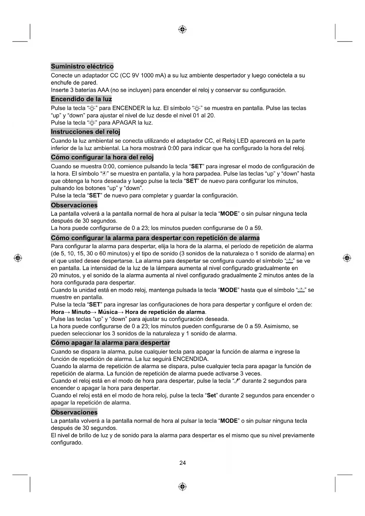 DE ALARMA TEMPORI- ZADOR ALTAVOZ BRILLO DE LCD DESPERTADOR FM24 Suministro eléctrico Conecte un adaptador CC (CC 9V 1000 mA) a su luz ambiente despertador y luego conéctela a su enchufe de pared. Inserte 3 baterías AAA (no se incluyen) para encender el reloj y conservar su configuración. Encendido de la luz Pulse la tecla “ ” para ENCENDER la luz. El símbolo “ ” se muestra en pantalla. Pulse las teclas “up” y “down” para ajustar el nivel de luz desde el nivel 01 al 20. Pulse la tecla “ ” para APAGAR la luz. Instrucciones del reloj Cuando la luz ambiental se conecta utilizando el adaptador CC, el Reloj LED aparecerá en la parte inferior de la luz ambiental. La hora mostrará 0:00 para indicar que ha configurado la hora del reloj. Cómo configurar la hora del reloj Cuando se muestra 0:00, comience pulsando la tecla “SET” para ingresar el modo de configuración de la hora. El símbolo “ ” se muestra en pantalla, y la hora parpadea. Pulse las teclas “up” y “down” hasta que obtenga la hora deseada y luego pulse la tecla “SET” de nuevo para configurar los minutos, pulsando los botones “up” y “down”. Pulse la tecla “SET” de nuevo para completar y guardar la configuración. Observaciones La pantalla volverá a la pantalla normal de hora al pulsar la tecla “MODE” o sin pulsar ninguna tecla después de 30 segundos. La hora puede configurarse de 0 a 23; los minutos pueden configurarse de 0 a 59. Cómo configurar la alarma para despertar con repetición de alarma Para configurar la alarma para despertar, elija la hora de la alarma, el período de repetición de alarma (de 5, 10, 15, 30 o 60 minutos) y el tipo de sonido (3 sonidos de la naturaleza o 1 sonido de alarma) en el que usted desee despertarse. La alarma para despertar se configura cuando el símbolo “ ” se ve en pantalla. La intensidad de la luz de la lámpara aumenta al nivel configurado gradualmente en 20 minutos, y el sonido de la alarma aumenta al nivel configurado gradualmente 2 minutos antes de la hora configurada para despertar. Cuando la unidad está en modo reloj, mantenga pulsada la tecla “MODE” hasta que el símbolo “ ” se muestre en pantalla. Pulse la tecla “SET” para ingresar las configuraciones de hora para despertar y configure el orden de: Hora→ Minuto→ Música→ Hora de repetición de alarma. Pulse las teclas “up” y “down” para ajustar su configuración deseada. La hora puede configurarse de 0 a 23; los minutos pueden configurarse de 0 a 59. Asimismo, se pueden seleccionar los 3 sonidos de la naturaleza y 1 sonido de alarma. Cómo apagar la alarma para despertar Cuando se dispara la alarma, pulse cualquier tecla para apagar la función de alarma e ingrese la función de repetición de alarma. La luz seguirá ENCENDIDA. Cuando la alarma de repetición de alarma se dispara, pulse cualquier tecla para apagar la función de repetición de alarma. La función de repetición de alarma puede activarse 3 veces. Cuando el reloj está en el modo de hora para despertar, pulse la tecla “ ” durante 2 segundos para encender o apagar la hora para despertar. Cuando el reloj está en el modo de hora reloj, pulse la tecla “Set” durante 2 segundos para encender o apagar la repetición de alarma. Observaciones La pantalla volverá a la pantalla normal de hora al pulsar la tecla “MODE” o sin pulsar ninguna tecla después de 30 segundos. El nivel de brillo de luz y de sonido para la alarma para despertar es el mismo que su nivel previamente configurado.25 Cómo configurar la hora de la alarma Cuando la unidad está en modo reloj, mantenga pulsada la tecla “MODE” hasta que el símbolo “ ” se muestre en pantalla. Pulse la tecla “SET” para ingresar las configuraciones de hora de la alarma y configure el orden de: Hora→ Minuto→ Música. Pulse las teclas “up” y “down” para ajustar su configuración deseada. La hora puede configurarse de 0 a 23; los minutos pueden configurarse de 0 a 59. Asimismo, se pueden seleccionar los 3 sonidos de la naturaleza y 1 sonido de alarma. Cómo apagar la alarma Cuando se dispara la alarma, pulse cualquier tecla para apagar la función de alarma e ingrese la función de repetición de alarma. La alarma sonará por 1 minuto, y la función de repetición de alarma puede activarse 3 veces. Cuando el reloj está en el modo de alarma, pulse la tecla “ ” durante 2 segundos para encender o apagar la alarma. Cuando el reloj está en el modo de repetición de alarma, pulse la tecla “Set” durante 2 segundos para encender o apagar la hora de repetición de alarma. Observaciones La pantalla volverá a la pantalla normal de hora al pulsar la tecla “MODE” o sin pulsar ninguna tecla después de 30 segundos. La alarma no funcionará si la hora de la alarma se configura dentro del período para despertar. Cómo configurar el temporizador Para configurar el temporizador, elija un tiempo de apagado (de 5, 15, 30 o 60 minutos) y el tipo de sonido (3 sonidos de la naturaleza o 1 sonido de alarma) que desee configurar. El temporizador se configura cuando el símbolo “ ” se ve en pantalla. La intensidad de la luz de la lámpara disminuye gradualmente hasta que se desvanece, y el sonido de la alarma disminuye gradualmente hasta que se silencia después de la hora del temporizador. Cuando la unidad está en modo reloj, mantenga pulsada la tecla “MODE” hasta que el símbolo “ ” se muestre en pantalla. Pulse la tecla “SET” para ingresar el tiempo de apagado de: 00:05→00:15→00:30→00:45→1:00→Música. Pulse las teclas “up” y “down” para ajustar su configuración deseada. Se pueden seleccionar 3 sonidos de la naturaleza y 1 sonido de alarma. Cómo apagar el temporizador Cuando el reloj está en el modo de temporizador, pulse la tecla “ ” durante 2 segundos para encender o apagar el temporizador. Observaciones La pantalla volverá a la pantalla normal de hora al pulsar la tecla