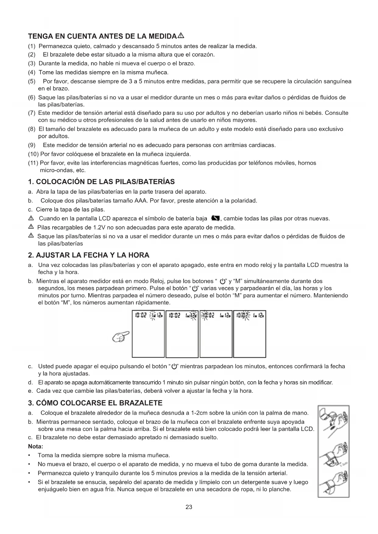 (1) Permanezca quieto, calmado y descansado 5 minutos antes de realizar la medida. (2) Elbrazaletedebeestarsituadoalamismaalturaqueelcorazón. (3) Durante la medida, no hable ni mueva el cuerpo o el brazo. (4) Tome las medidas siempre en la misma muñeca. (5) Porfavor,descansesiemprede3a5minutosentremedidas,parapermitirqueserecuperelacirculaciónsanguínea en el brazo. (6) Saque las pilas/baterías si no va a usar el medidor durante un mes o más para evitar daños o pérdidas de fluidos de las pilas/baterías. (7) Estemedidordetensiónarterialestádiseñadoparasuusoporadultosynodeberíanusarloniñosnibebés.Consulte con su médico u otros profesionales de la salud antes de usarlo en niños mayores. (8) El tamaño del brazalete es adecuado para la muñeca de un adulto y este modelo está diseñado para uso exclusivo por adultos. (9) Estemedidordetensiónarterialnoesadecuadoparapersonasconarritmiascardiacas. (10)Porfavorcolóqueseelbrazaleteenlamuñecaizquierda. (11)Porfavor,evitelasinterferenciasmagnéticasfuertes,comolasproducidasporteléfonosmóviles,hornos micro-ondas, etc.