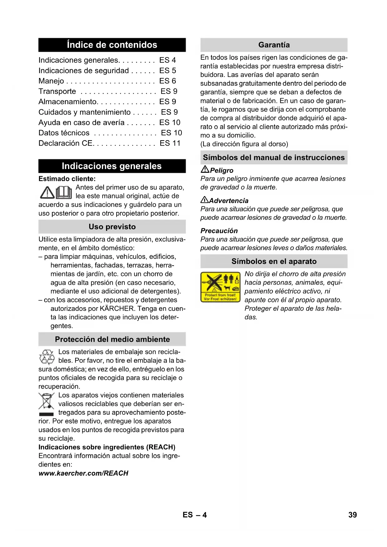 89 dB(A) EG-conformiteitsverklaring Product: Hogedrukreiniger Type: 1.674-xxx Van toepassing zijnde EG-richtlijnen 2006/42/EG (+2009/127/EG) 2004/108//EG 2000/14/EG Toegepaste geharmoniseerde normen EN 55014–1: 2006 + A1: 2009 EN 55014–2: 1997 + A2: 2008 EN 60335–1 EN 60335–2–79 EN 61000–3–2: 2006 + A2: 2009 EN 61000–3–3: 2008 EN 62233: 2008 Toegepaste conformiteitsbeoordelingsprocedure 2000/14/EG: Bijlage V Geluidsvermogensniveau dB(A) Gemeten: 86 Gegarandeerd: 89 CEO Head of Approbation 38 NL– 4 Estimado cliente: Antes del primer uso de su aparato, lea este manual original, actúe de acuerdo a sus indicaciones y guárdelo para un uso posterior o para otro propietario posterior. Utilice esta limpiadora de alta presión, exclusiva- mente, en el ámbito doméstico: – para limpiar máquinas, vehículos, edificios, herramientas, fachadas, terrazas, herra- mientas de jardín, etc. con un chorro de agua de alta presión (en caso necesario, mediante el uso adicional de detergentes). – con los accesorios, repuestos y detergentes autorizados por KÄRCHER. Tenga en cuen- ta las indicaciones que incluyen los deter- gentes. Los materiales de embalaje son recicla- bles. Por favor, no tire el embalaje a la ba- sura doméstica; en vez de ello, entréguelo en los puntos oficiales de recogida para su reciclaje o recuperación. Los aparatos viejos contienen materiales valiosos reciclables que deberían ser en- tregados para su aprovechamiento poste- rior. Por este motivo, entregue los aparatos usados en los puntos de recogida previstos para su reciclaje. Indicaciones sobre ingredientes (REACH) Encontrará información actual sobre los ingre- dientes en: www.kaercher.com/REACH En todos los países rigen las condiciones de ga- rantía establecidas por nuestra empresa distri- buidora. Las averías del aparato serán subsanadas gratuitamente dentro del periodo de garantía, siempre que se deban a defectos de material o de fabricación. En un caso de garan- tía, le rogamos que se dirija con el comprobante de compra al distribuidor donde adquirió el apa- rato o al servicio al cliente autorizado más próxi- mo a su domicilio. (La dirección figura al dorso) Peligro Para un peligro inminente que acarrea lesiones de gravedad o la muerte. 몇 Advertencia Para una situación que puede ser peligrosa, que puede acarrear lesiones de gravedad o la muerte. Precaución Para una situación que puede ser peligrosa, que puede acarrear lesiones leves o daños materiales. No dirija el chorro de alta presión hacia personas, animales, equi- pamiento eléctrico activo, ni apunte con él al propio aparato. Proteger el aparato de las hela- das. Índice de contenidos Indicaciones generales. . . . . . . . . ES 4 Indicaciones de seguridad . . . . . . ES 5 Manejo . . . . . . . . . . . . . . . . . . . . . ES 6 Transporte . . . . . . . . . . . . . . . . . . ES 9 Almacenamiento. . . . . . . . . . . . . . ES 9 Cuidados y mantenimiento . . . . . . ES 9 Ayuda en caso de avería . . . . . . . ES 10 Datos técnicos . . . . . . . . . . . . . . . ES 10 Declaración CE. . . . . . . . . . . . . . . ES 11 Indicaciones generales Uso previsto Protección del medio ambiente Garantía Símbolos del manual de instrucciones Símbolos en el aparato 39ES– 5 Peligro No toque nunca el enchufe de red o la toma de corriente con las manos mojadas. No ponga el aparato en funcionamiento si el cable de conexión a red u otras partes im- portantes del aparato, como pueden ser la manguera de alta presión, la pistola pulveri- zadora o los dispositivos de seguridad pre- sentan daños. Antes de cada puesta en servicio, comprue- be si el cable de conexión a red y el enchufe de red presentan daños. Si el cable de co- nexión a red estuviera deteriorado, debe en- cargar sin demora a un electricista especializado del servicio de atención al cliente autorizado que lo sustituya. Antes de cada puesta en servicio, comprue- be si la manguera de alta presión presenta daños. Si la manguera de alta presión pre- sentase daños, debe sustituirla sin demora. Está prohibido usar el aparato en zonas en las que exista riesgo de explosiones. Para usar el aparato en zonas con peligro de explosión (p. ej., gasolineras) son de obliga- do cumplimiento las normas de seguridad correspondientes. Los chorros a alta presión pueden ser peli- grosos si se usan indebidamente. No dirija el chorro hacia personas, animales o equipa- miento eléctrico activo, ni apunte con él al propio aparato. No dirija el chorro hacia otras personas o ha- cia sí mismo para limpiar ropa o calzado. No rocíe objetos que puedan contener sustan- cias nocivas para la salud (p. ej., asbesto). El chorro a alta presión puede dañar los neu- máticos del vehículo y sus válvulas y los puede reventar. Un primer síntoma de que se están provocando daños es el cambio de tonalidad de los neumáticos. Los neumáti- cos de vehículo y las válvulas de neumáticos deteriorados suponen un peligro mortal. Al efectuar la limpieza, aplique el chorro a una distancia mínima de 30 cm. Peligro de explosiones No pulverizar ningun líquido inflamable. No aspire nunca líquidos que contengan di- solventes o ácidos y disolventes sin diluir. Entre estos se encuentran, p. ej., la gasoli- na, los diluyentes cromáticos o el fuel. La ne- blina pulverizada es altamente inflamable, explosiva y tóxica. No utilice acetona ni áci- dos o disolventes sin diluir, ya que pueden afectar negativamente a los materiales em- pleados en el aparato. 몇 Advertencia El enchufe y acoplamiento del cable de pro- longación deben ser impermeables y no de- ben sumergirse en agua. El uso de cables de prolongación inadecua- dos puede resultar peligroso. Para el exte- rior, utilice sólo cables prolongadores autorizados para exterior, adecuadamente marcados y con una sección de cable sufi- ciente: 1 - 10 m: 1,5 mm