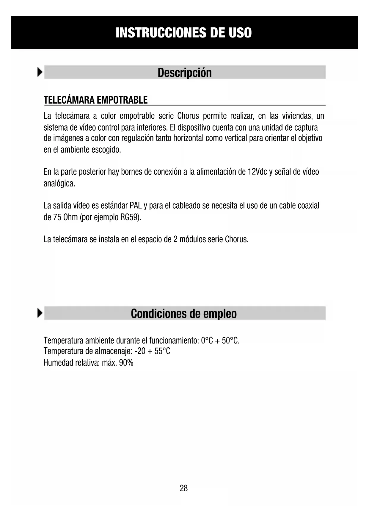 La telecámara a color empotentre série Chorus permite realizar, en las viviendas, un Sistema de video control para interiores. El dispositivo cuenta con una unidad de captura de imagenes a color con regulacion tanto horizontal como vertical para orientar el objetivo en el ambiente escogido.