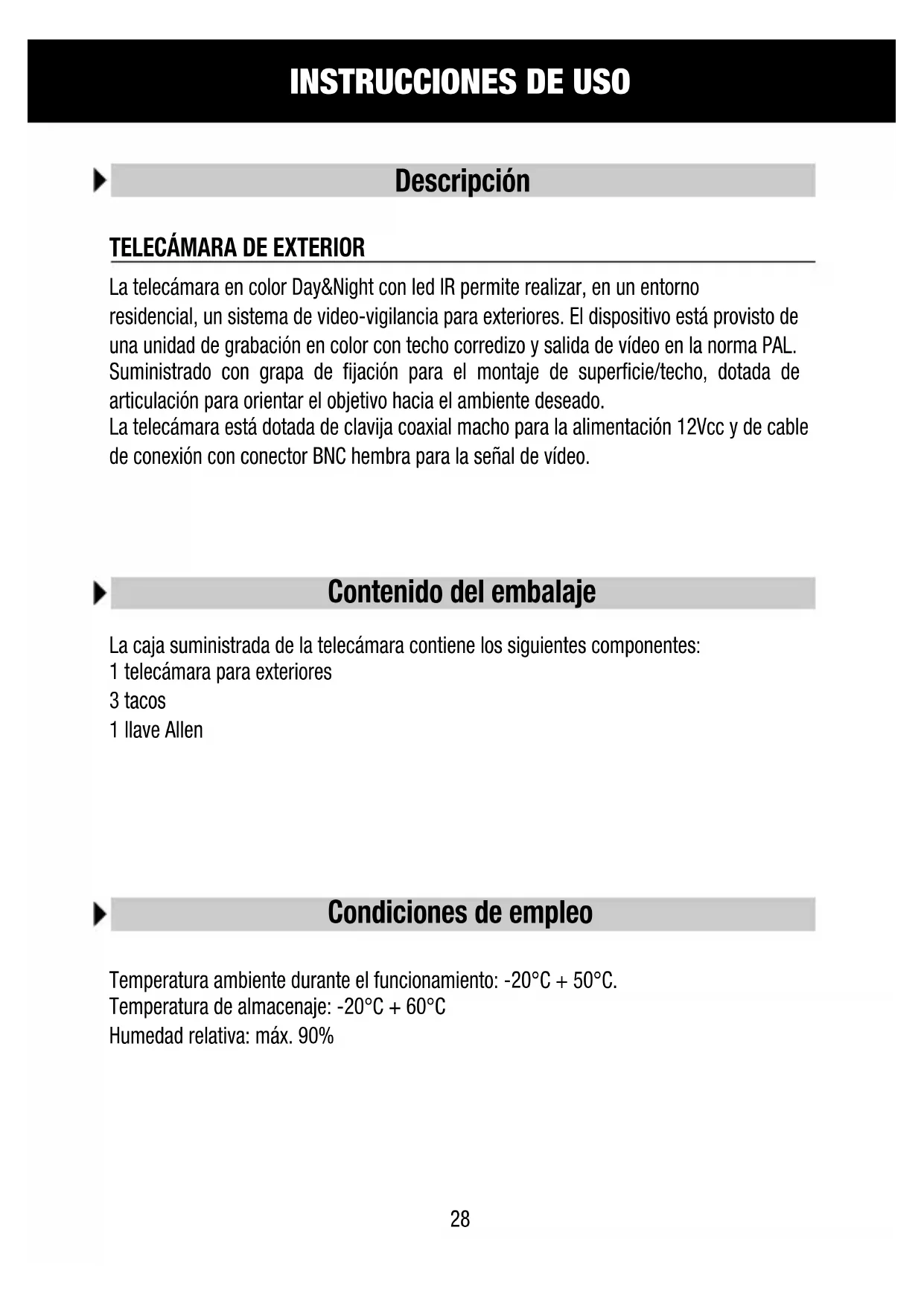 La telecámara en color Day&Night con led IR permite realizar, en un entorno residencial, un sistema de video-vigilancia para exteriores. El dispositivo está provisto de una unidad de grabación en color con techo corredizo y salida de vídeo en la norma PAL. Suministrado con grapa de fijación para el montaje de superficie/techo, dotada de articulación para orientar el objetivo hacia el ambiente deseado. La telecámara está dotada de clavija coaxial macho para la alimentación 12Vcc y de cable de conexión con conector BNC hembra para la señal de vídeo. Temperatura ambiente durante el funcionamiento: -20°C + 50°C. Temperatura de almacenaje: -20°C + 60°C Humedad relativa: máx. 90% Condiciones de empleo Contenido del embalaje La caja suministrada de la telecámara contiene los siguientes componentes: 1 telecámara para exteriores 3 tacos 1 llave AllenE