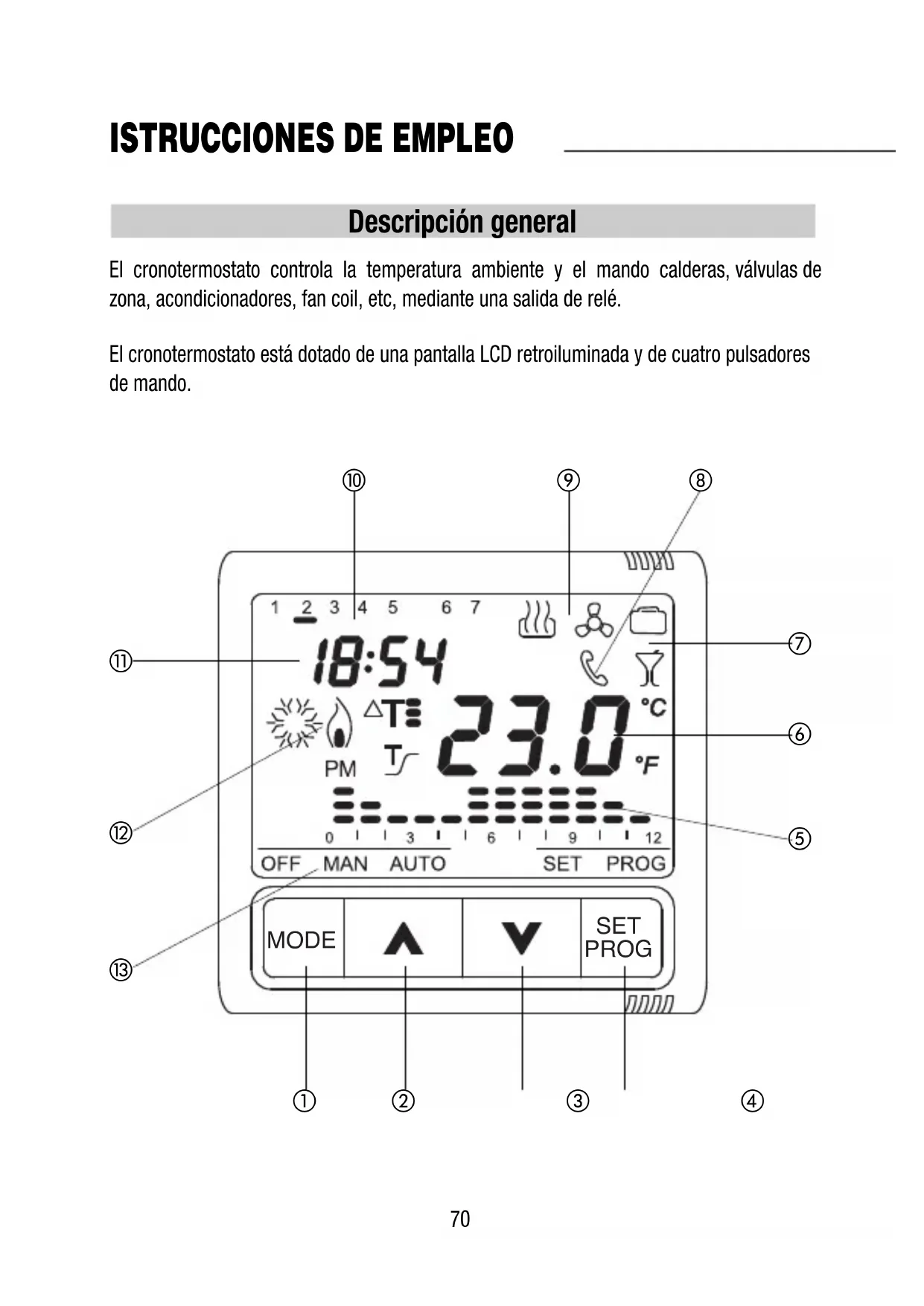 El cronotermostat está dotado de una pantalla LCD retroiluminada y de quatre pulsadores de mando.