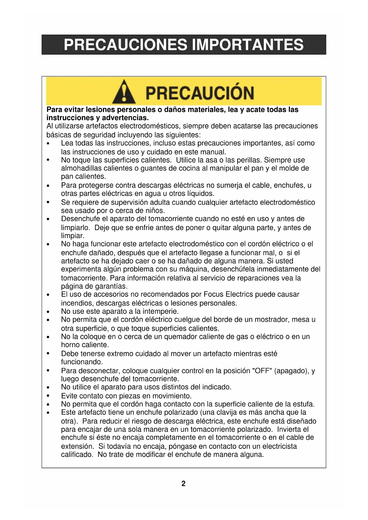 ESTA GARANTIA REEMPLAZA A TODAS LAS DEMÁS GARANTías IMPLICITAS, INCLUYENDO AQUELLAS DE COMERCIABILIDAD, IDONEIDAD PARA UN FIN O USO EN PARTICULAR, DESEMPENO, U OTROS TIPOS, LAS CUALES QEDAN EXCLUIDAS MEDIANTE EL PRESENTE DOCUMENTO. FOCUS ELECTRICS RECHAZA TODA RESPONSABILIDAD POR DANOS, YA SEAN DIRECTOS, INDIRECTOS, INCIDENTALES, PREVISIBLES, CONSECUENTES O ESPECIALIES QUE SURJAN DE Este APARATO ELECTRODOMÉSTICO O GUARDEN RELACION CON EL MISMO.