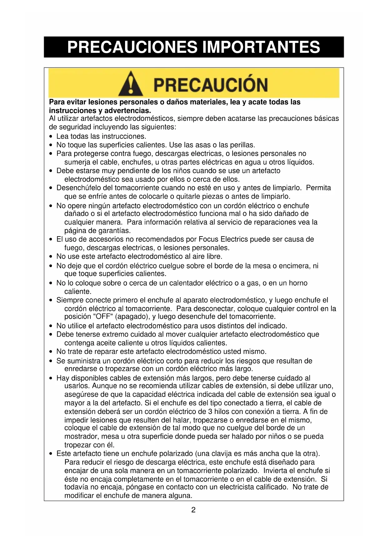 Si piensa que el artefacto electrodomístico se ha danado o requires de service bajo de su periodo de garantía, por favorpongase en contacto con el Departamento de Atencion al Cliente de Focus Electrics por el (866) 290-1851 o contactenos por correto electronomic a la service@focuselectrics.com. Los gastos de devolución no son reembolsables. Para todas las reclamaciones de garantía, se requires un recibo que demuestra la Fecha de compra original, los recibosculositos a mano no son aceptados. Focus Electrics, LLC no se hace responsable de las devoluciones perdidas en transito.