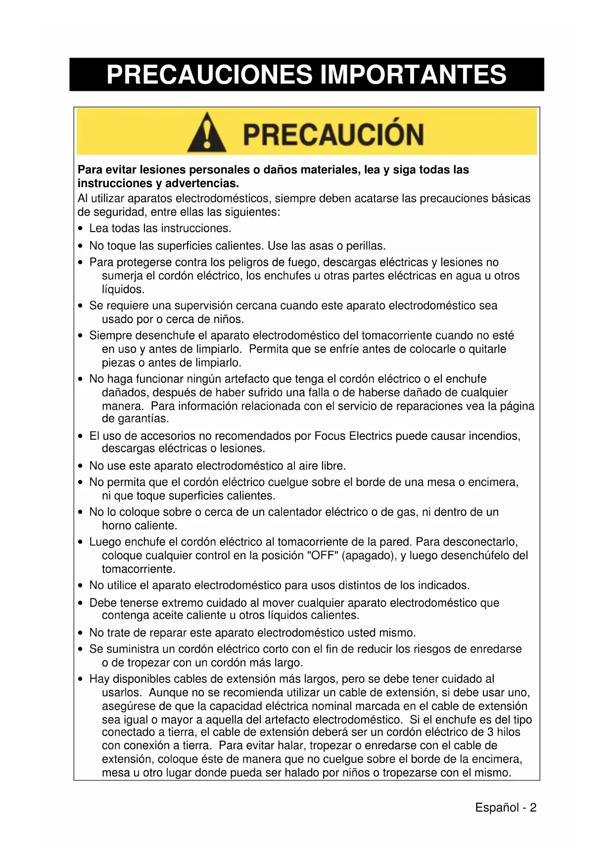 ESTA GARANTÍA REEMPLAZA A TODAS LAS DEMÁS GARANTías IMPLICITAS, INCLUYENDO AQUELLAS DE COMERCIABILIDAD, IDONEIDAD PARA UN FIN O USO EN PARTICULAR, DESEMPENO, U OTROS TIPOS, LAS CUALES QEDAN EXCLUIDAS MEDIANTE EL PRESENTE DOCUMENTO. FOCUS ELECTRICS, LLC RECHAZA TODA RESPONSABILIDAD POR DANOS, YA SEAN DIRECTOS, INDIRECTOS, INCIDENTALES, PREVISIBLES, CONSECUENTES O ESPECIALIES QUE SURJAN DE Este APARATO ELECTRODOMÉSTICO O GUARDEN RELACION CON EL MISMO.