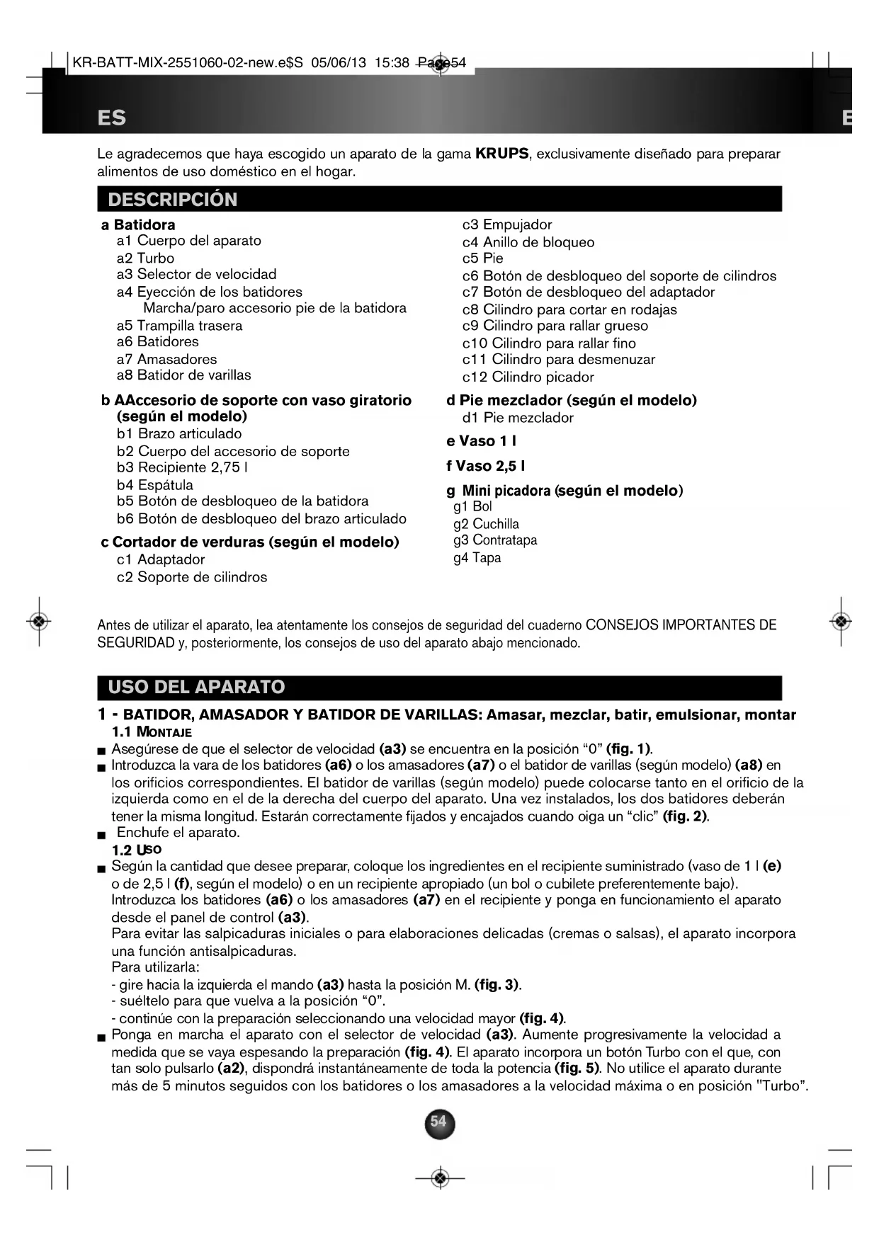 ES Antes de utilizar el aparato, lea atentamente los consejos de seguridad del cuaderno CONSEJOS IMPORTANTES DE SEGURIDAD y, posteriormente, los consejos de uso del aparato abajo mencionado. KR-BATT-MIX-2551060-02-new.e$S 05/06/13 15:38 Page5455