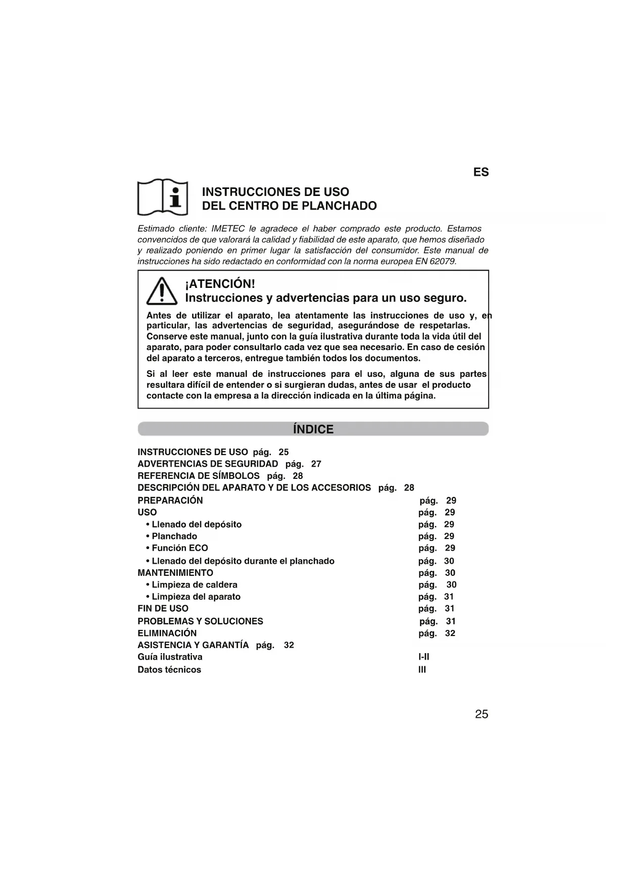24ES INSTRUCCIONES DE USO DEL CENTRO DE PLANCHADO Estimado cliente: IMETEC le agradece el haber comprado este producto. Estamos