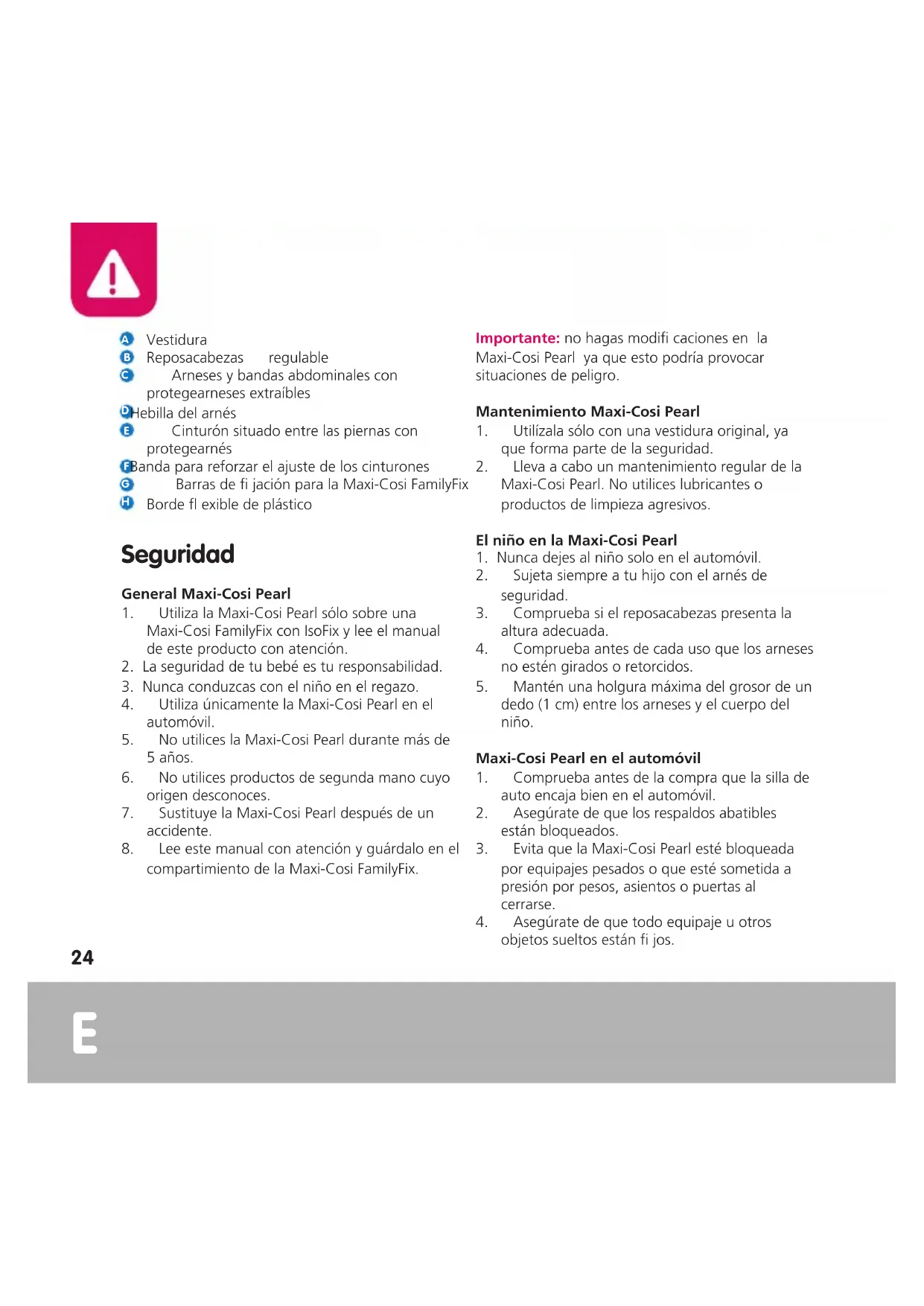automóvil esté a pleno sol. La vestidura, las partes metálicas y de plástico se calientan mucho y pueden llegar a quemar la delicada piel del niño. Importante: coloca siempre la Maxi-Cosi Pearl en el sentido de la marcha sobre la Maxi-Cosi FamilyFix en el automóvil. Medio ambiente Mantén los materiales plásticos de embalaje fuera del alcance de los niños para evitar el riesgo de asfi xia. Cuando ya no utilices el producto, sepáralo de los residuos domésticos en conformidad con la legislación ambiental local. Preguntas Si tienes preguntas siempre te puedes poner en contacto con el distribuidor local de Maxi-Cosi (visita www.maxi-cosi.com para los datos de contacto). Asegúrate de que tienes a mano la siguiente información: - Número de serie en la parte baja de la pegatina ECE naranja, - Marca y modelo de automóvil y asiento sobre el que se usa la Maxi-Cosi Pearl, - Edad, altura y peso de tu hijo.