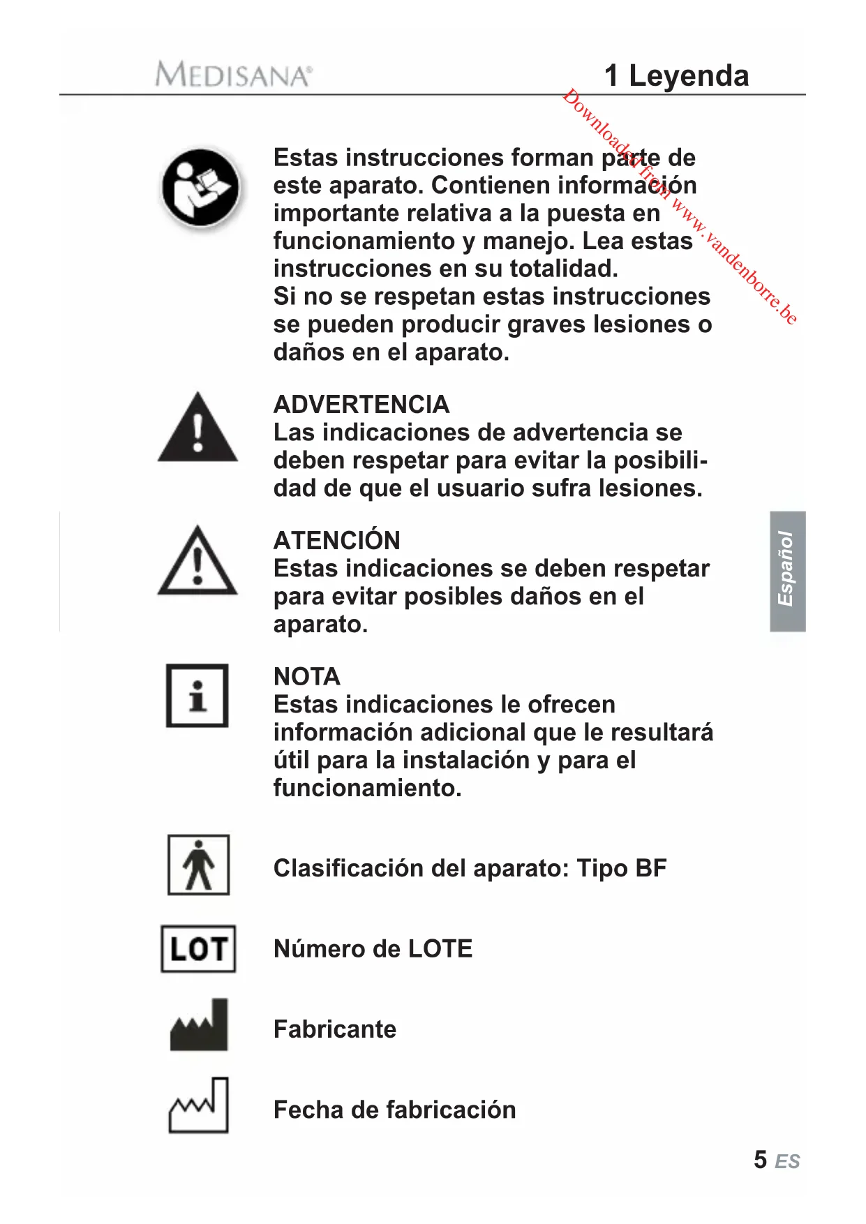 Downloaded from www.vandenborre.be1 Leyenda 5 ES Estas instrucciones forman parte de este aparato. Contienen información importante relativa a la puesta en funcionamiento y manejo. Lea estas instrucciones en su totalidad. Si no se respetan estas instrucciones se pueden producir graves lesiones o daños en el aparato. ADVERTENCIA Las indicaciones de advertencia se deben respetar para evitar la posibili- dad de que el usuario sufra lesiones. ATENCIÓN Estas indicaciones se deben respetar para evitar posibles daños en el aparato. NOTA Estas indicaciones le ofrecen información adicional que le resultará útil para la instalación y para el funcionamiento. Clasificación del aparato: Tipo BF Número de LOTE Fabricante Fecha de fabricación Español Downloaded from www.vandenborre.be2 Indicaciones de seguridad 6 ES ¡NOTAS IMPORTANTES! ¡CONSERVAR SIN FALTA! Antes de utilizar el aparato, lea detenidamente las instrucciones de manejo, especialmente las indicaciones de seguridad; guarde estas instrucciones para su consulta posterior. Si cede el aparato a terceras personas, entregue también estas instrucciones de manejo. Indicaciones de seguridad