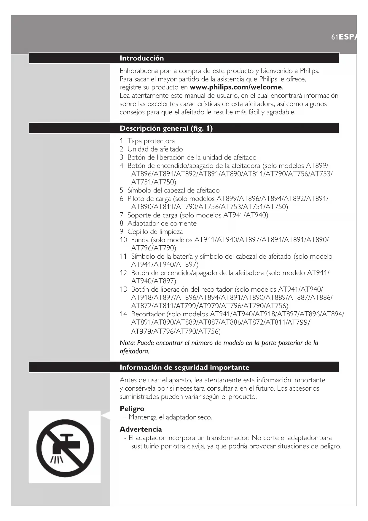 Η συσκευή δεν είναι σχεδιασμένη για να χρησιμοποιείται όταν είναι συνδεδεμένη στο ρεύμα. Επαναφορτίστε την μπαταρία (δείτε το κεφάλαιο “Φόρτιση”) και αποσυνδέστε την από την πρίζα. ΕΛΛΗΝΙΚΑ6061ESPAÑOL Introducción Enhorabuena por la compra de este producto y bienvenido a Philips. Para sacar el mayor partido de la asistencia que Philips le ofrece, registre su producto en www.philips.com/welcome. Lea atentamente este manual de usuario, en el cual encontrará información sobre las excelentes características de esta afeitadora, así como algunos consejos para que el afeitado le resulte más fácil y agradable. Descripción general (g. 1) 1 Tapa protectora 2 Unidad de afeitado 3 Botón de liberación de la unidad de afeitado 4 Botón de encendido/apagado de la afeitadora (solo modelos AT899/ AT896/AT894/AT892/AT891/AT890/AT811/AT790/AT756/AT753/ AT751/AT750) 5 Símbolo del cabezal de afeitado 6 Piloto de carga (solo modelos AT899/AT896/AT894/AT892/AT891/ AT890/AT811/AT790/AT756/AT753/AT751/AT750) 7 Soporte de carga (solo modelos AT941/AT940) 8 Adaptador de corriente 9 Cepillo de limpieza 10 Funda (solo modelos AT941/AT940/AT897/AT894/AT891/AT890/ AT796/AT790) 11 Símbolo de la batería y símbolo del cabezal de afeitado (solo modelo AT941/AT940/AT897) 12 Botón de encendido/apagado de la afeitadora (solo modelo AT941/ AT940/AT897) 13 Botón de liberación del recortador (solo modelos AT941/AT940/ AT918/AT897/AT896/AT894/AT891/AT890/AT889/AT887/AT886/ AT872/AT811/AT799/AT979/AT796/AT790/AT756) 14 Recortador (solo modelos AT941/AT940/AT918/AT897/AT896/AT894/ AT891/AT890/AT889/AT887/AT886/AT872/AT811/ AT799/ AT979/AT796/AT790/AT756) Nota: Puede encontrar el número de modelo en la parte posterior de la afeitadora. Información de seguridad importante Antes de usar el aparato, lea atentamente esta información importante y consérvela por si necesitara consultarla en el futuro. Los accesorios suministrados pueden variar según el producto. Peligro - Mantenga el adaptador seco. Advertencia - El adaptador incorpora un transformador. No corte el adaptador para sustituirlo por otra clavija, ya que podría provocar situaciones de peligro.- Este aparato puede ser usado por niños a partir de 8 años y por personas con su capacidad física, psíquica o sensorial reducida y por quienes no tengan los conocimientos y la experiencia necesarios, si han sido supervisados o instruidos acerca del uso del aparato de forma segura y siempre que sepan los riesgos que conlleva su uso. No permita que los niños jueguen con el aparato. Los niños no deben llevar a cabo la limpieza ni el mantenimiento a menos que sean supervisados. - Desenchufe siempre la afeitadora antes de limpiarla bajo el grifo. - Compruebe siempre el aparato y los accesorios antes de utilizarlos. No utilice el aparato ni los accesorios si están dañados, ya que podrían producirse lesiones. Sustituya siempre una pieza dañada por una del modelo original. Precaución - No sumerja nunca el soporte de carga en agua ni lo enjuague bajo el grifo. - Utilice este aparato solo para el uso al que está destinado como se indica en el manual de usuario. - Por razones de higiene, el aparato debería ser usado únicamente por una persona. - No enchufe el adaptador a tomas de corriente eléctrica que tengan un ambientador conectado o que lo hayan tenido para evitar daños irreparables en el adaptador. - No utilice nunca aire comprimido, estropajos, agentes abrasivos ni líquidos agresivos, como gasolina o acetona, para limpiar el aparato. - Cuando enjuague la afeitadora es posible que salga agua por el oricio de su parte inferior. Esto es normal y no es peligroso, ya que todos los sistemas electrónicos están dentro de una unidad motora hermética en el interior de la afeitadora. Campos electromagnéticos (CEM) - Este aparato de Philips cumple los estándares y las normativas aplicables sobre exposición a campos electromagnéticos. General - Esta afeitadora es resistente al agua. Se puede utilizar en la bañera o en la ducha y se puede limpiar bajo el grifo. Por tanto, la afeitadora solo puede utilizarse sin cable por motivos de seguridad. - Este aparato es adecuado para voltajes de red de 100 a 240 voltios. - El adaptador transforma la corriente de 100 - 240 voltios en un bajo voltaje de seguridad inferior a 24 voltios. - Nivel de ruido máximo: Lc = 69 dB(A) Carga Nota: La afeitadora no se puede utilizar enchufada directamente a la red. Cuando cargue la afeitadora por primera vez, o después de un largo periodo sin usarla, cárguela hasta que el piloto de carga se ilumine de manera continua. Consulte la tabla siguiente para conocer el tiempo de carga de su afeitadora.Tiempo de carga 1 hora 8 horas AT941, AT940, AT918 AT897, AT896, AT894 AT892, AT891, AT890 AT889, AT887, AT886 AT899, AT896, AT872 , AT799, AT797, AT796, AT790 AT770, AT756, AT753 AT751, AT750 AT811 El tiempo de afeitado puede ser inferior al indicado a continuación en la tabla como resultado de su forma de afeitarse, sus hábitos de limpieza o su tipo de barba. Minutos de afeitado 60 min. 50 min. 45 min. 40 min AT941 AT899 AT790, AT756, AT753 AT940 AT897, AT894, AT892 AT891, AT890, AT811, AT799 AT896 AT751, AT750 Indicaciones de carga Batería baja - Modelos AT941/AT940/AT897: Cuando la batería está casi descargada (cuando quedan 5 minutos o menos de afeitado), el símbolo de la batería naranja comienza a parpadear. Al apagar la afeitadora, el símbolo de la batería naranja sigue parpadeando durante unos segundos. - AT899, AT896, AT918, AT896, AT894, AT891, AT890, AT889, AT887, AT886, AT872, AT811, AT799, AT797, AT796, AT790, AT770, AT756,AT753, AT751, AT750: cuando la batería está casi descargada (cuando quedan cinco minutos o menos de afeitado), el piloto de carga comienza a parpadear en naranja. Al apagar la afeitadora, 