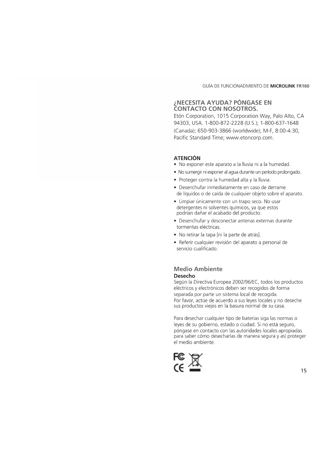 Para Obtener un service de reparación de su producto, recomendamos, lo primero, que usted se ponga en contacto con unrepresentante del service de reparación de Eton, llamando al 800-872-2228 EE.UU., 800-637-1648 Canadó (650) 903-3866 para determinar el problema y su solución. Si se requiriera un service adicular, el personal技术服务 le instruira acerca de como proceder,dependiendo de si la radio está toda bajo garantía o de si necesita un service de no garantía.