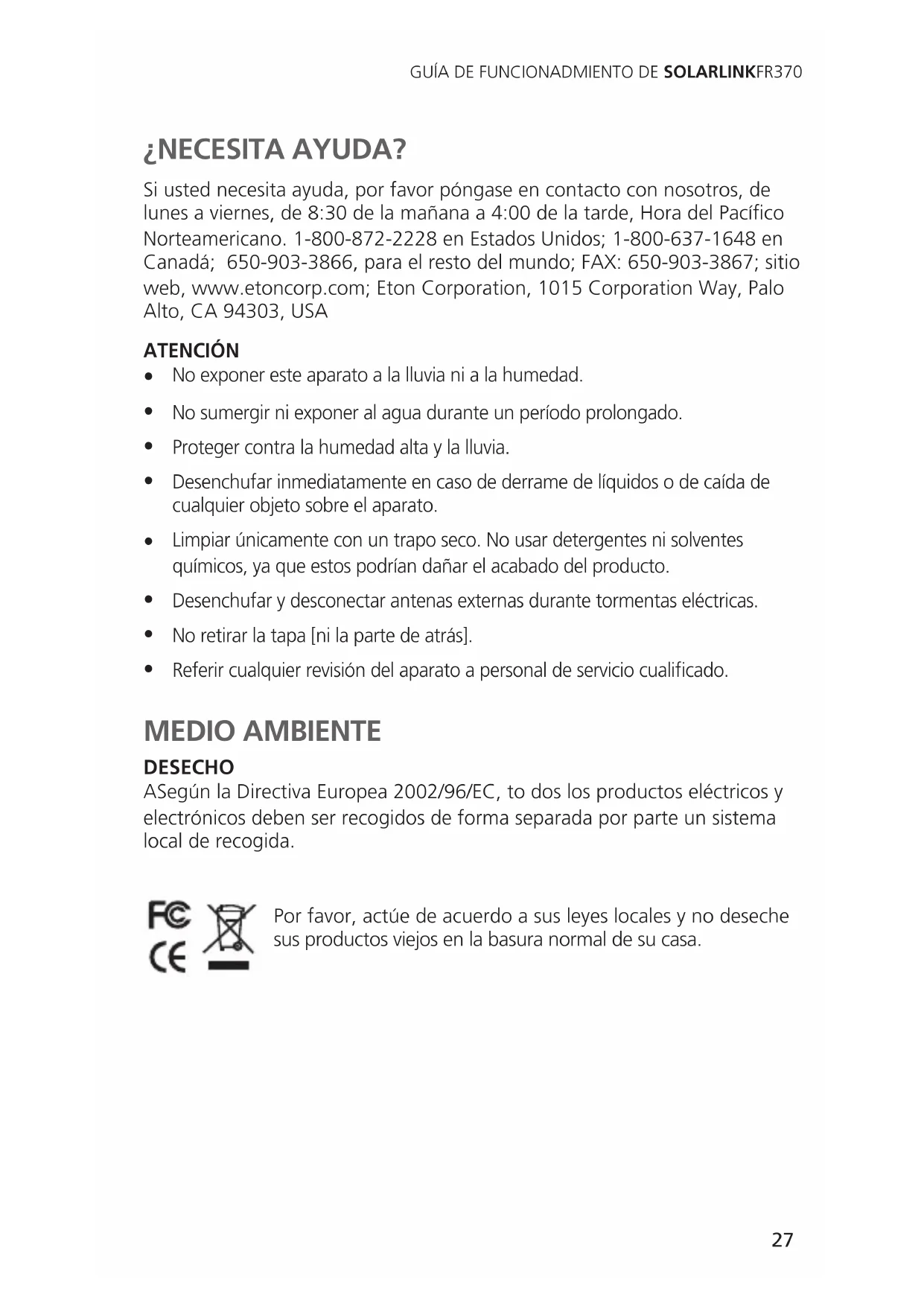Si usted necesita ahora, por favor póngase en contacto con nosotros, de lunes a viernes, de 8:30 de lamania a 4:00 de la tarde, Hora del Pacífico Norteamericano. 1-800-872-2228 en Estados Unidos; 1-800-637-1648 en Canadá; 650-903-3866, para el resto del mundo; FAX: 650-903-3867; sitio web, www.etoncorp.com; Eton Corporation, 1015 Corporation Way, Palo Alto, CA 94303, USA