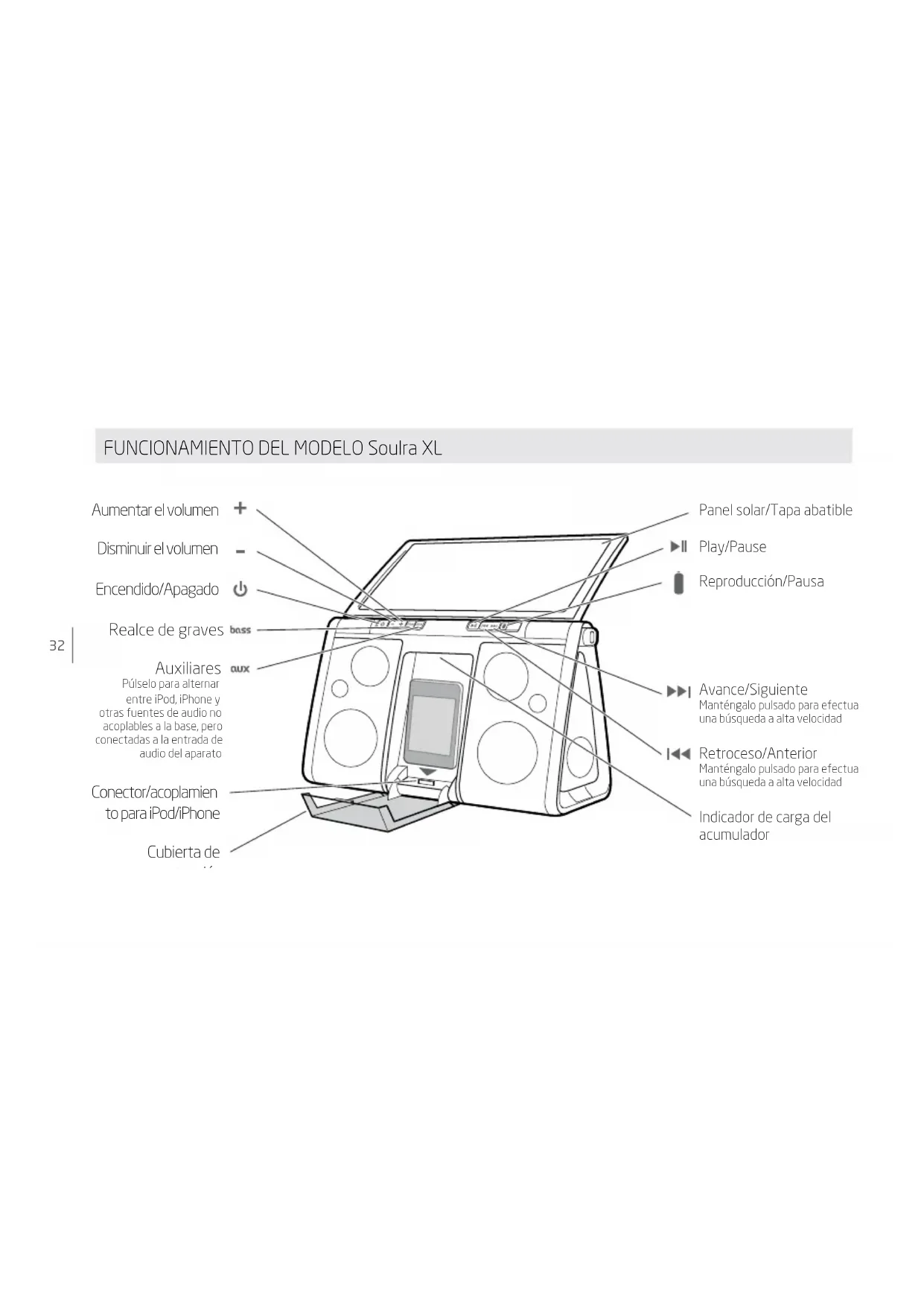 Gracias por haberse decidido a adquirir el producto de Etón modelo Soulra XL, se tratate de una base de acoplimiento para iPhone® e/o iPod® que proportionscna una alta calidad de sonido. Elmodelo Soulra XL recibe alimentacion electrica de su accumulator recargable de iOn de litio, el cual能把 cargarse ya sea mediana el panel solar integrado en el aparato o bien utilizing el adaptorador de corriente suministrado. Le rogamos que se tome el tiempo necessario para leer detenidamente este manual del usuario y se familiarice con el funcionaamento de su Soulra XL a fin de poder disfurutar al maximum de sus functions y caracteristicas.