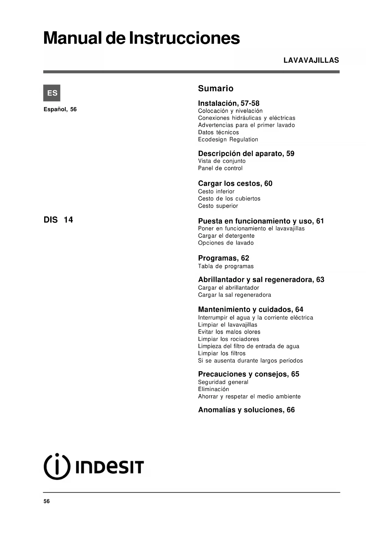 DIS 14 - Lavavajillas INDESIT - Manual de uso y guía de instrucciones gratis