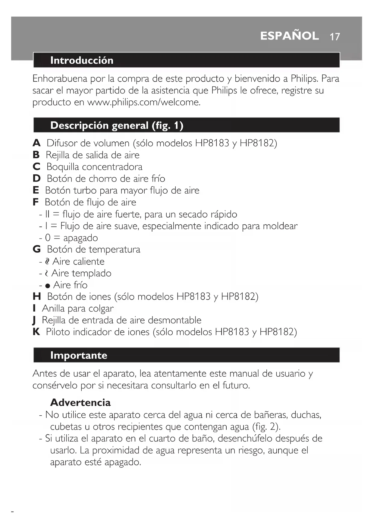 ESPAÑOL18- Este aparato ha de ser usado solamente para secar cabello humano.