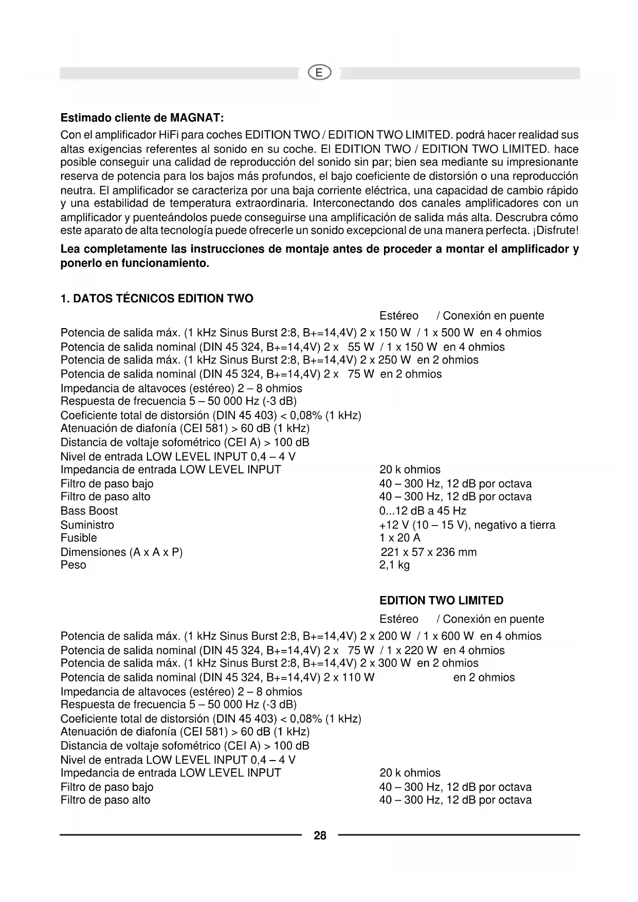 Estimado cliente de MAGNAT: Con el amplificador HiFi para coches EDITION TWO / EDITION TWO LIMITED. podrá hacer realidad sus altas exigencias referentes al sonido en su coche. El EDITION TWO / EDITION TWO LIMITED. hace posible conseguir una calidad de reproducción del sonido sin par; bien sea mediante su impresionante reserva de potencia para los bajos más profundos, el bajo coeficiente de distorsión o una reproducción neutra. El amplificador se caracteriza por una baja corriente eléctrica, una capacidad de cambio rápido y una estabilidad de temperatura extraordinaria. Interconectando dos canales amplificadores con un amplificador y puenteándolos puede conseguirse una amplificación de salida más alta. Descrubra cómo este aparato de alta tecnología puede ofrecerle un sonido excepcional de una manera perfecta. ¡Disfrute! Lea completamente las instrucciones de montaje antes de proceder a montar el amplificador y ponerlo en funcionamiento.
