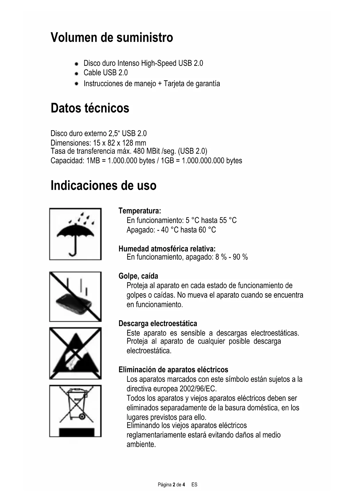 2,5“ MEMORYBOARDPágina 2 de 4 ES Volumen de suministro Disco duro Intenso High-Speed USB 2.0 Cable USB 2.0 Instrucciones de manejo + Tarjeta de garantía Datos técnicos Disco duro externo 2,5“ USB 2.0 Dimensiones: 15 x 82 x 128 mm Tasa de transferencia máx. 480 MBit /seg. (USB 2.0) Capacidad: 1MB = 1.000.000 bytes / 1GB = 1.000.000.000 bytes Indicaciones de uso Temperatura: En funcionamiento: 5 °C hasta 55 °C Apagado: - 40 °C hasta 60 °C Humedad atmosférica relativa: En funcionamiento, apagado: 8 % - 90 % Golpe, caída Proteja al aparato en cada estado de funcionamiento de golpes o caídas. No mueva el aparato cuando se encuentra en funcionamiento. Descarga electroestática Este aparato es sensible a descargas electroestáticas. Proteja al aparato de cualquier posible descarga electroestática. Eliminación de aparatos eléctricos Los aparatos marcados con este símbolo están sujetos a la directiva europea 2002/96/EC. Todos los aparatos y viejos aparatos eléctricos deben ser eliminados separadamente de la basura doméstica, en los lugares previstos para ello. Eliminando los viejos aparatos eléctricos reglamentariamente estará evitando daños al medio ambiente.Página 3 de 4 ES Instrucciones de instalación Requerimientos de sistema: Este disco duro es compatible con los sistemas operativos MS Windows XP/Vista/Windows7 y Mac OS 10.x . Aviso: La configuración de hardware de su PC y el sistema operativo instalado pueden tener efecto sobre la compatibilidad del disco duro. Conectar el disco duro: