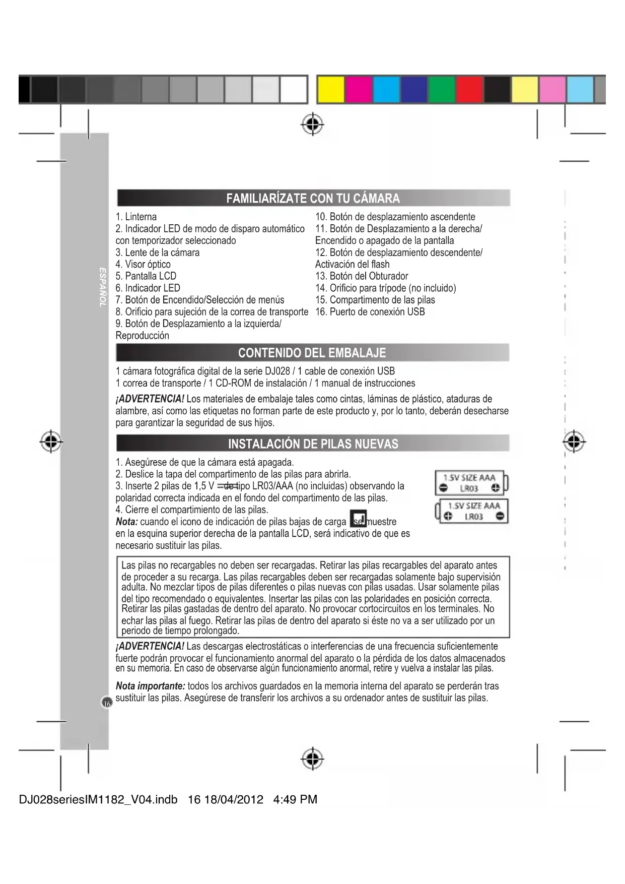 ESPAÑOL FAMILIARÍZATE CON TU CÁMARA CONTENIDO DEL EMBALAJE INSTALACIÓN DE PILAS NUEVAS