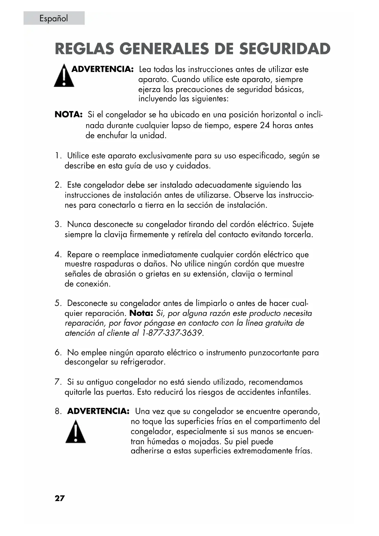 8. ADVERTENCIA: Una vez que su congelador se encuentre operando,
