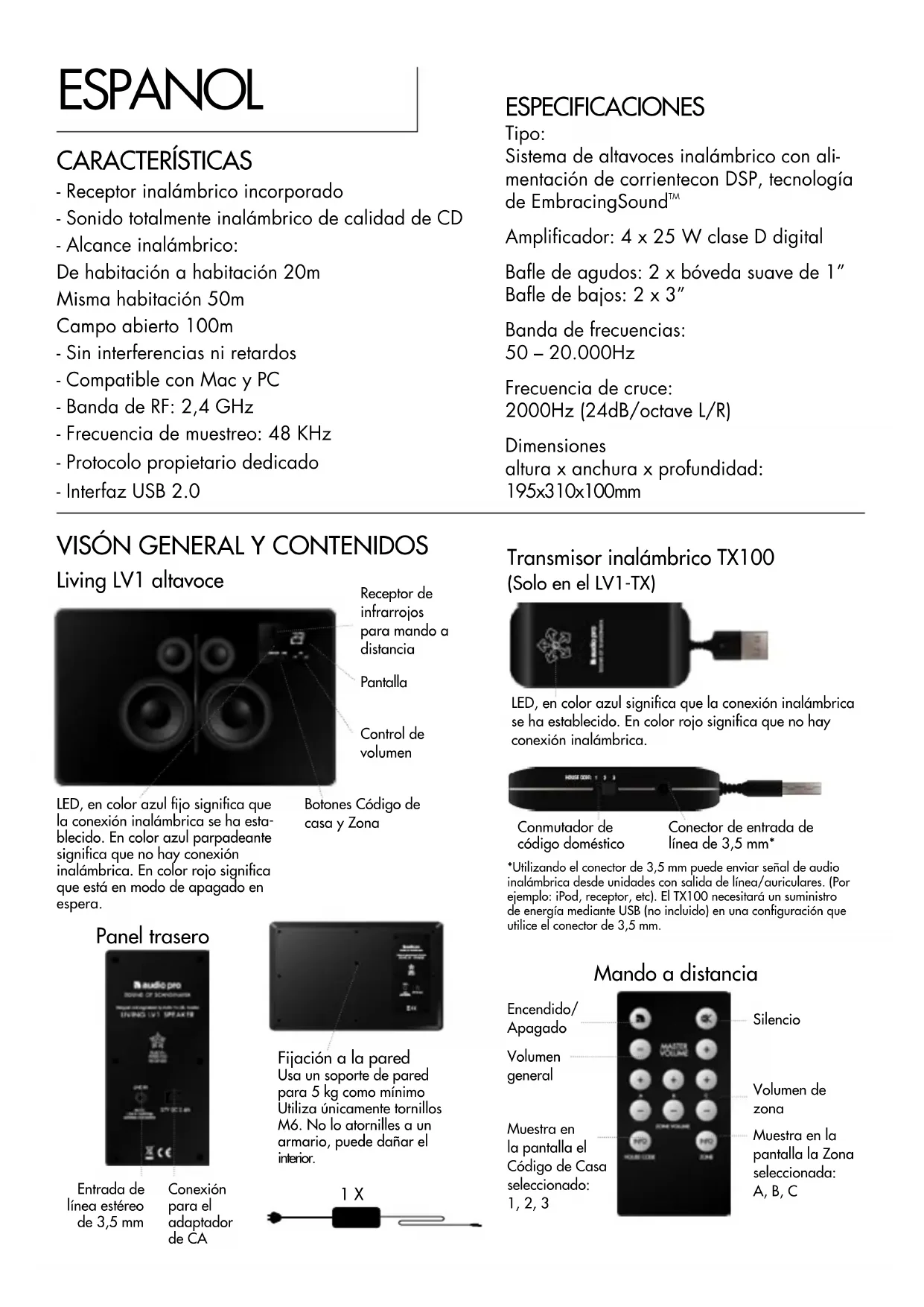 Living LV1 altavoce Receptor de infrarrojos para mando a distanciaPantalla Panel trasero LED, en color azul fijo significa que la conexión inalámbrica se ha esta-blecido. En color azul parpadeante significa que no hay conexión inalámbrica. En color rojo significa que está en modo de apagado en espera.Botones Código de casa y ZonaControl de volumenConexión para el adaptador de CAEntrada de línea estéreo de 3,5 mm Mando a distancia Encendido/ApagadoSilencioMuestra en la pantalla la Zona seleccionada: A, B, CMuestra en la pantalla el Código de Casa seleccionado: 1, 2, 3Volumen generalVolumen de zona Transmisor inalámbrico TX100 (Solo en el LV1-TX) Fijación a la pared Usa un soporte de pared para 5 kg como mínimoUtiliza únicamente tornillos M6. No lo atornilles a un armario, puede dañar el interior. 1 X Conmutador de código domésticoLED, en color azul significa que la conexión inalámbrica se ha establecido. En color rojo significa que no hay conexión inalámbrica.Conector de entrada de línea de 3,5 mm**Utilizando el conector de 3,5 mm puede enviar señal de audio inalámbrica desde unidades con salida de línea/auriculares. (Por ejemplo: iPod, receptor, etc). El TX100 necesitará un suministro de energía mediante USB (no incluido) en una configuración que utilice el conector de 3,5 mm.CONEXIÓN POR CABLE