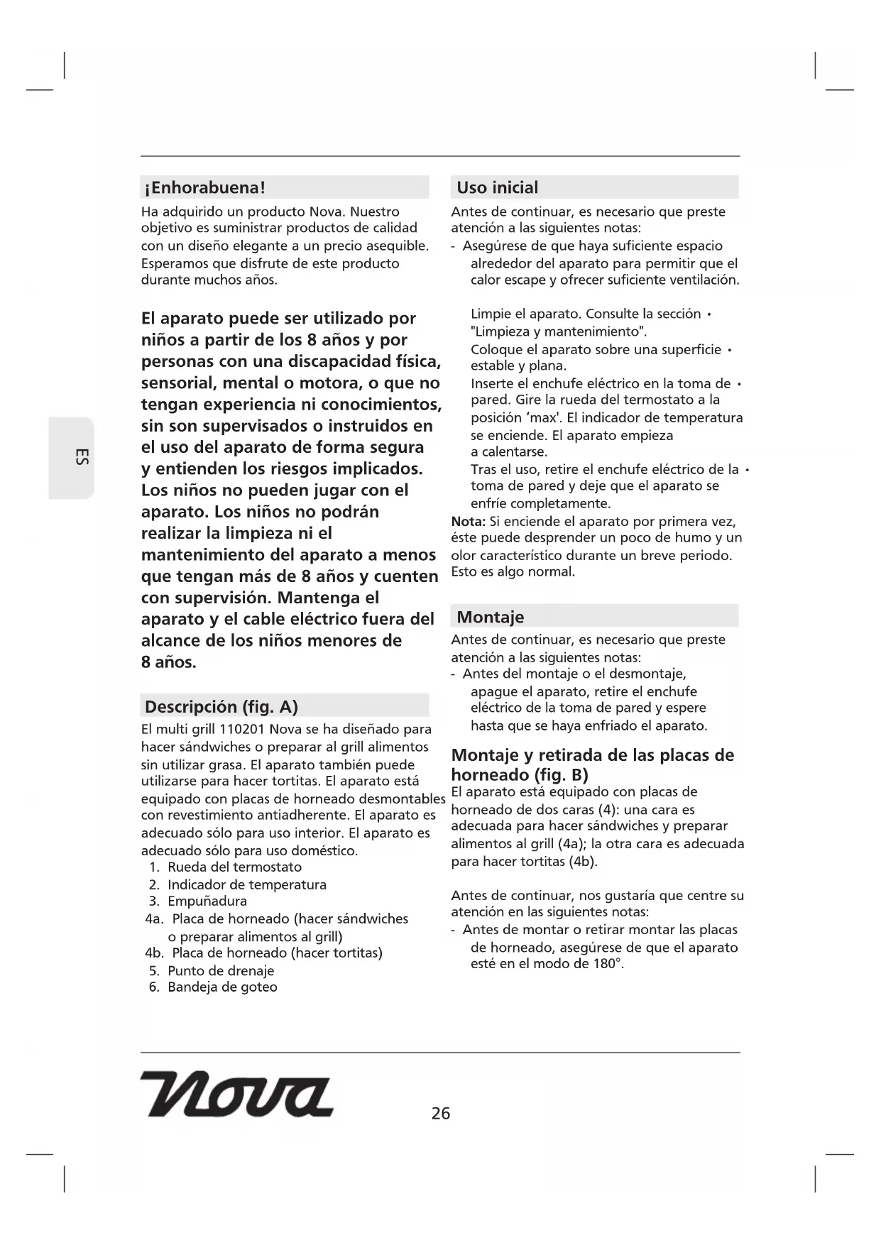 ¡Enhorabuena! Ha adquirido un producto Nova. Nuestro objetivo es suministrar productos de calidad con un diseño elegante a un precio asequible. Esperamos que disfrute de este producto durante muchos años. El aparato puede ser utilizado por niños a partir de los 8 años y por personas con una discapacidad física, sensorial, mental o motora, o que no tengan experiencia ni conocimientos, sin son supervisados o instruidos en el uso del aparato de forma segura y entienden los riesgos implicados. Los niños no pueden jugar con el aparato. Los niños no podrán realizar la limpieza ni el mantenimiento del aparato a menos que tengan más de 8 años y cuenten con supervisión. Mantenga el aparato y el cable eléctrico fuera del alcance de los niños menores de 8 años. Descripción (fig. A) El multi grill 110201 Nova se ha diseñado para hacer sándwiches o preparar al grill alimentos sin utilizar grasa. El aparato también puede utilizarse para hacer tortitas. El aparato está equipado con placas de horneado desmontables con revestimiento antiadherente. El aparato es adecuado sólo para uso interior. El aparato es adecuado sólo para uso doméstico.