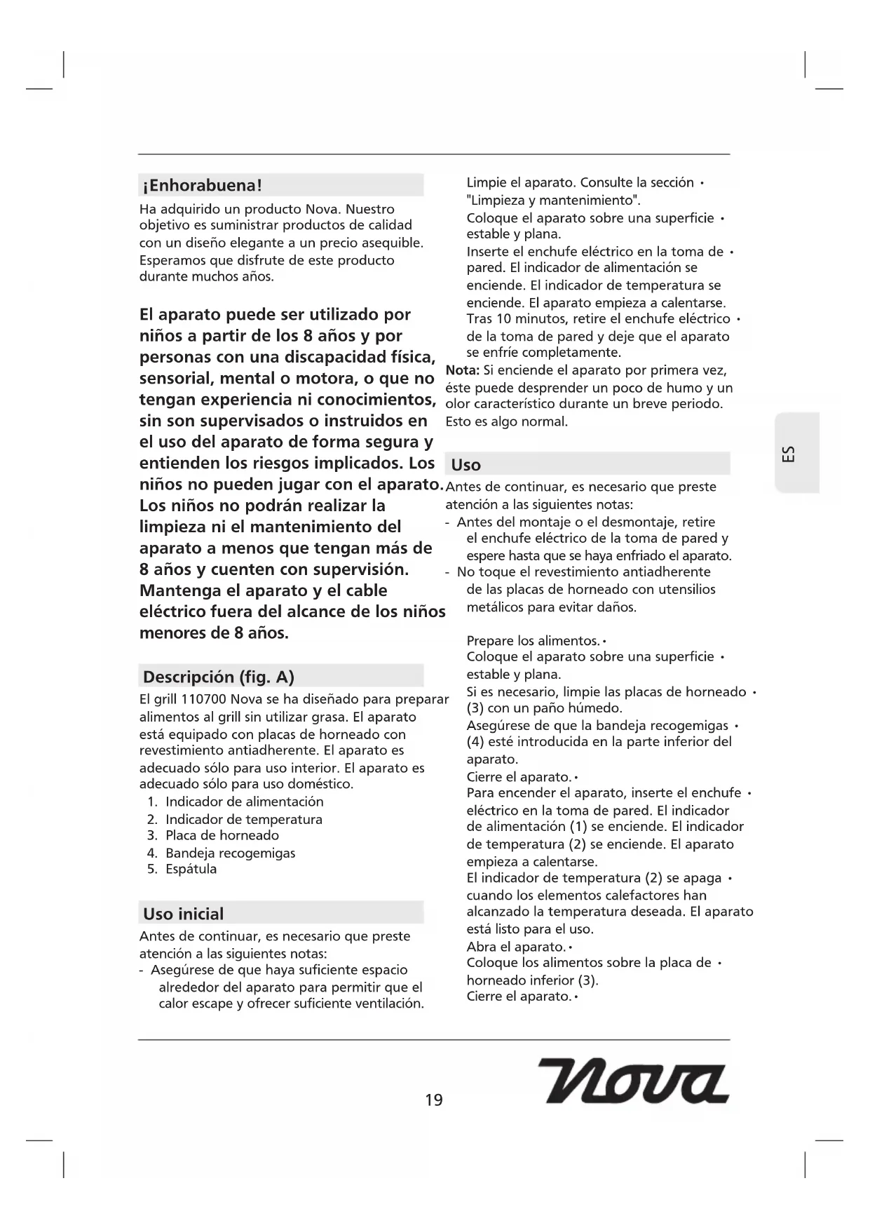 ¡Enhorabuena! Ha adquirido un producto Nova. Nuestro objetivo es suministrar productos de calidad con un diseño elegante a un precio asequible. Esperamos que disfrute de este producto durante muchos años. El aparato puede ser utilizado por niños a partir de los 8 años y por personas con una discapacidad física, sensorial, mental o motora, o que no tengan experiencia ni conocimientos, sin son supervisados o instruidos en el uso del aparato de forma segura y entienden los riesgos implicados. Los niños no pueden jugar con el aparato. Los niños no podrán realizar la limpieza ni el mantenimiento del aparato a menos que tengan más de 8 años y cuenten con supervisión. Mantenga el aparato y el cable eléctrico fuera del alcance de los niños menores de 8 años. Descripción (fig. A) El grill 110700 Nova se ha diseñado para preparar alimentos al grill sin utilizar grasa. El aparato está equipado con placas de horneado con revestimiento antiadherente. El aparato es adecuado sólo para uso interior. El aparato es adecuado sólo para uso doméstico.