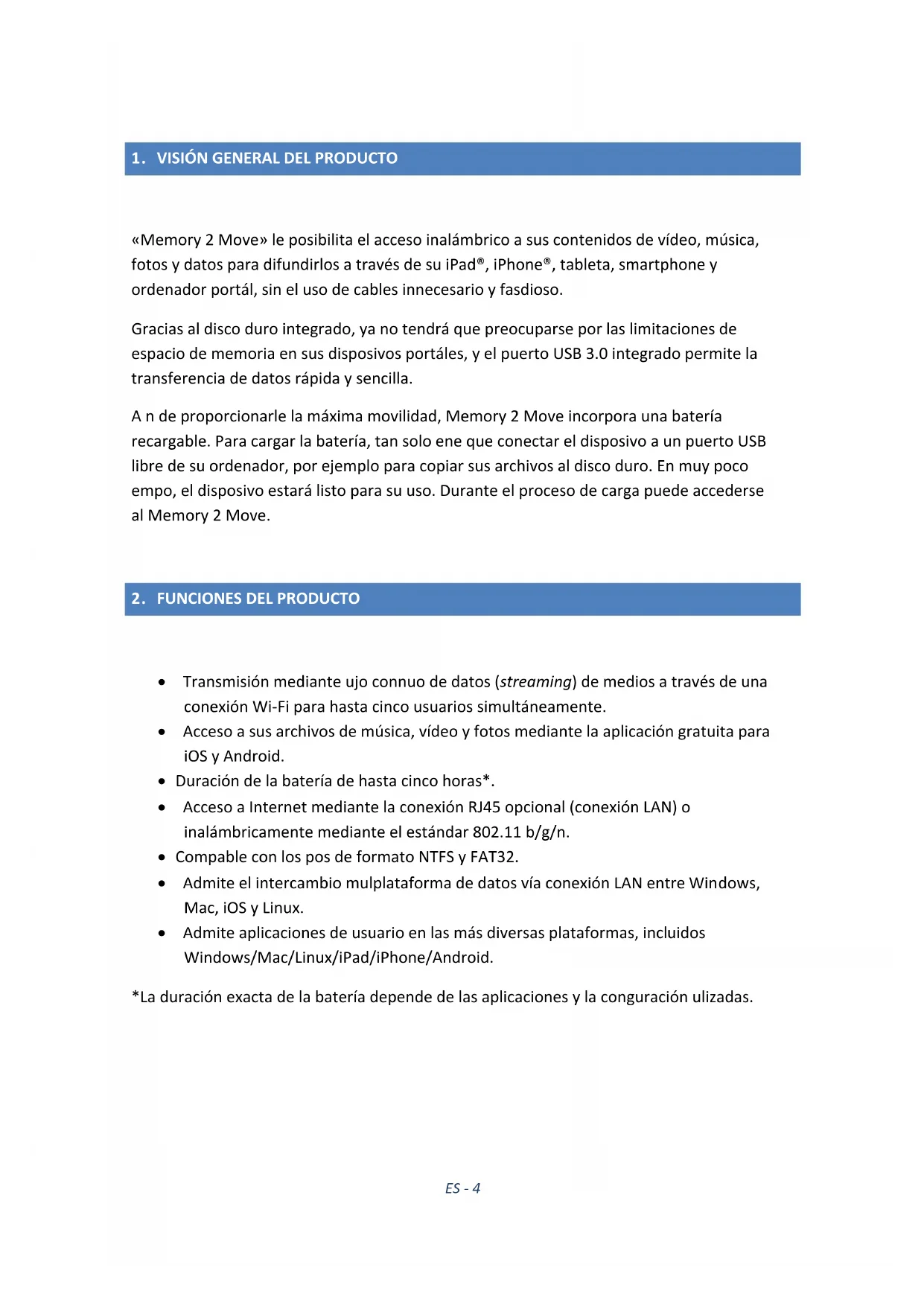 Transmisión mediante flujo continuo de datos (streaming) de medios a través de una conexión Wi-Fi para hasta cinco usuarios simultáneamente. Acceso a sus archivos de música, vídeo y fotos mediante la aplicación gratuita para iOS y Android. Duración de la batería de hasta cinco horas*. Acceso a Internet mediante la conexión RJ45 opcional (conexión LAN) o inalámbricamente mediante el estándar 802.11 b/g/n. Compatible con los tipos de formato NTFS y FAT32. Admite el intercambio multiplataforma de datos vía conexión LAN entre Windows, Mac, iOS y Linux. Admite aplicaciones de usuario en las más diversas plataformas, incluidos Windows/Mac/Linux/iPad/iPhone/Android. *La duración exacta de la batería depende de las aplicaciones y la configuración utilizadas.ES - 5 Utilización como disco duro externo: El puerto USB 3.0 incorporado posibilita la transferencia rápida de datos y puede cargar la batería interna al conectar el Memory 2 Move a un ordenador o una fuente de alimentación, respectivamente. Esto sólo funciona cuando el dispositivo está apagado. Utilización mediante conexión LAN: Para ello, conecte un extremo de su cable RJ45 al Memory 2 Move y el otro extremo a un puerto libre de su enrutador. A continuación active la función DHCP en su Memory 2 Move para obtener la asignación automática de la dirección IP.