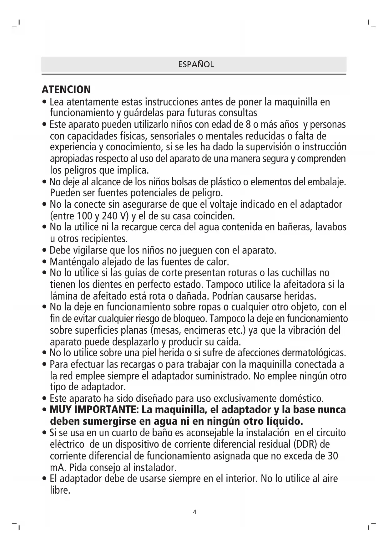 - MUY IMPORTANTE: La maquinilla, el adaptador y la base nunca deben sumergirse en agua ni en ningún otro líquido.