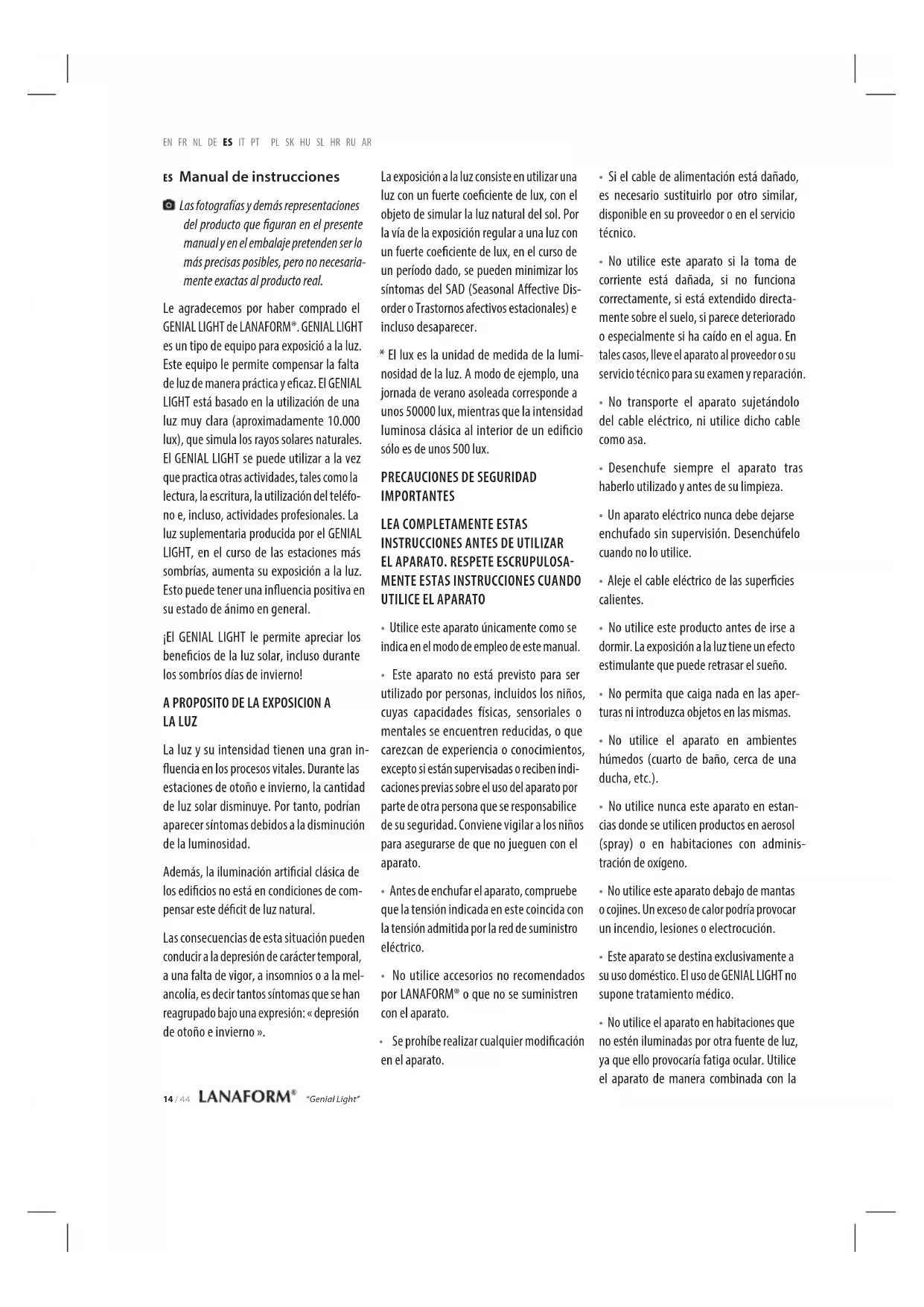 Encuentra gratis el manual del aparato Genial Light LANAFORM en formato PDF.
