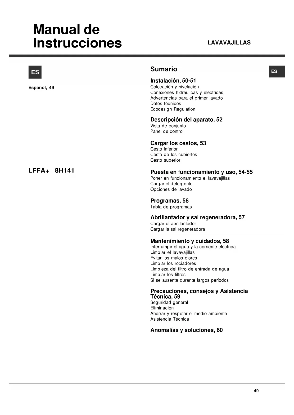 Manual de Instrucciones Sumario Instalación, 50-51 Colocación y nivelación Conexiones hidráulicas y eléctricas Advertencias para el primer lavado Datos técnicos Ecodesign Regulation Descripción del aparato, 52 Vista de conjunto Panel de control Cargar los cestos, 53 Cesto inferior Cesto de los cubiertos Cesto superior Puesta en funcionamiento y uso, 54-55 Poner en funcionamiento el lavavajillas Cargar el detergente Opciones de lavado Programas, 56 Tabla de programas Abrillantador y sal regeneradora, 57 Cargar el abrillantador Cargar la sal regeneradora Mantenimiento y cuidados, 58 Interrumpir el agua y la corriente eléctrica Limpiar el lavavajillas Evitar los malos olores Limpiar los rociadores Limpieza del filtro de entrada de agua Limpiar los filtros Si se ausenta durante largos períodos Precauciones, consejos y Asistencia Técnica, 59 Seguridad general Eliminación Ahorrar y respetar el medio ambiente Asistencia Técnica Anomalías y soluciones, 60