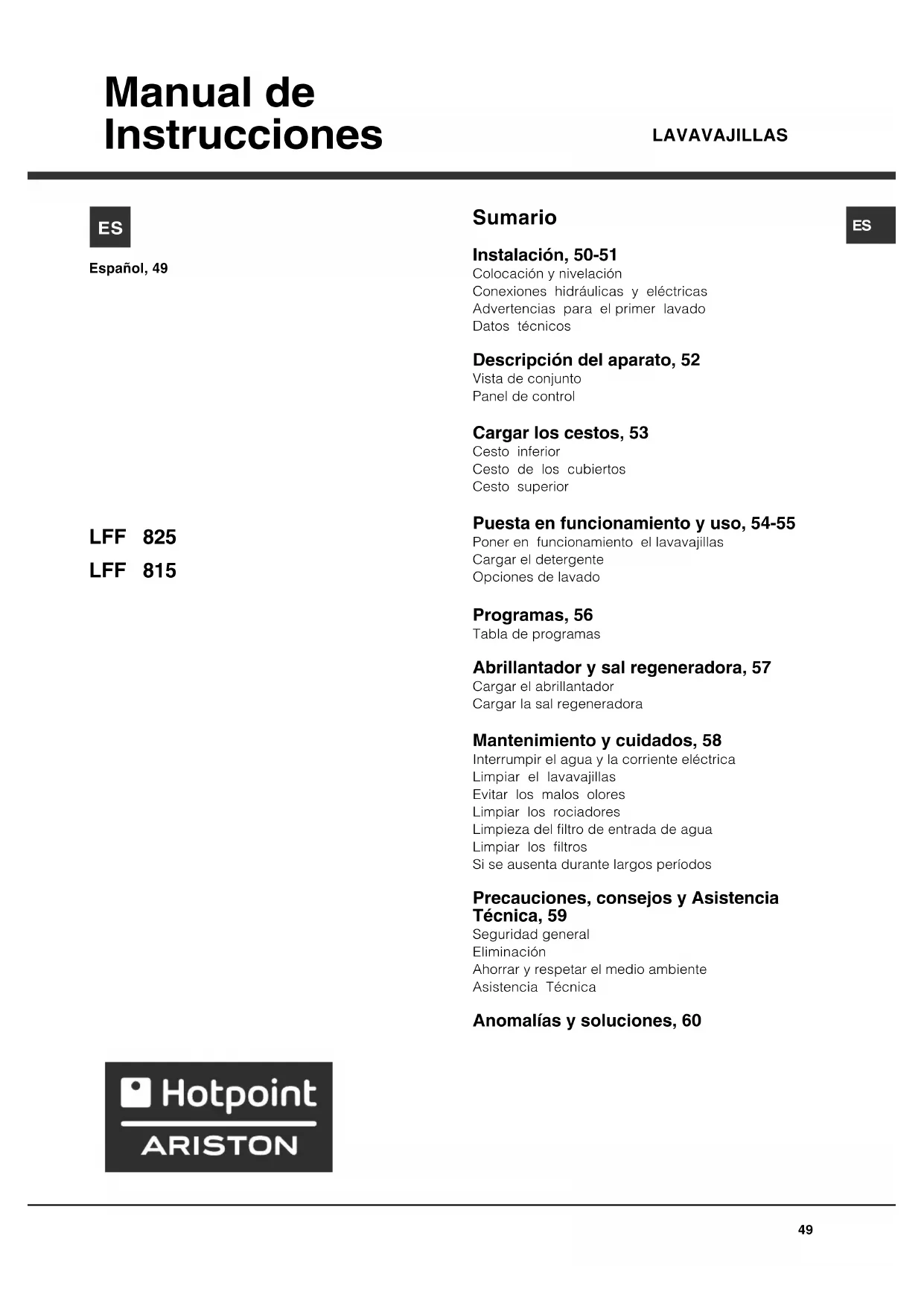 LFF 815 EUHA.R - Lavavajillas HOTPOINT ARISTON - Manual de uso y guía de instrucciones gratis