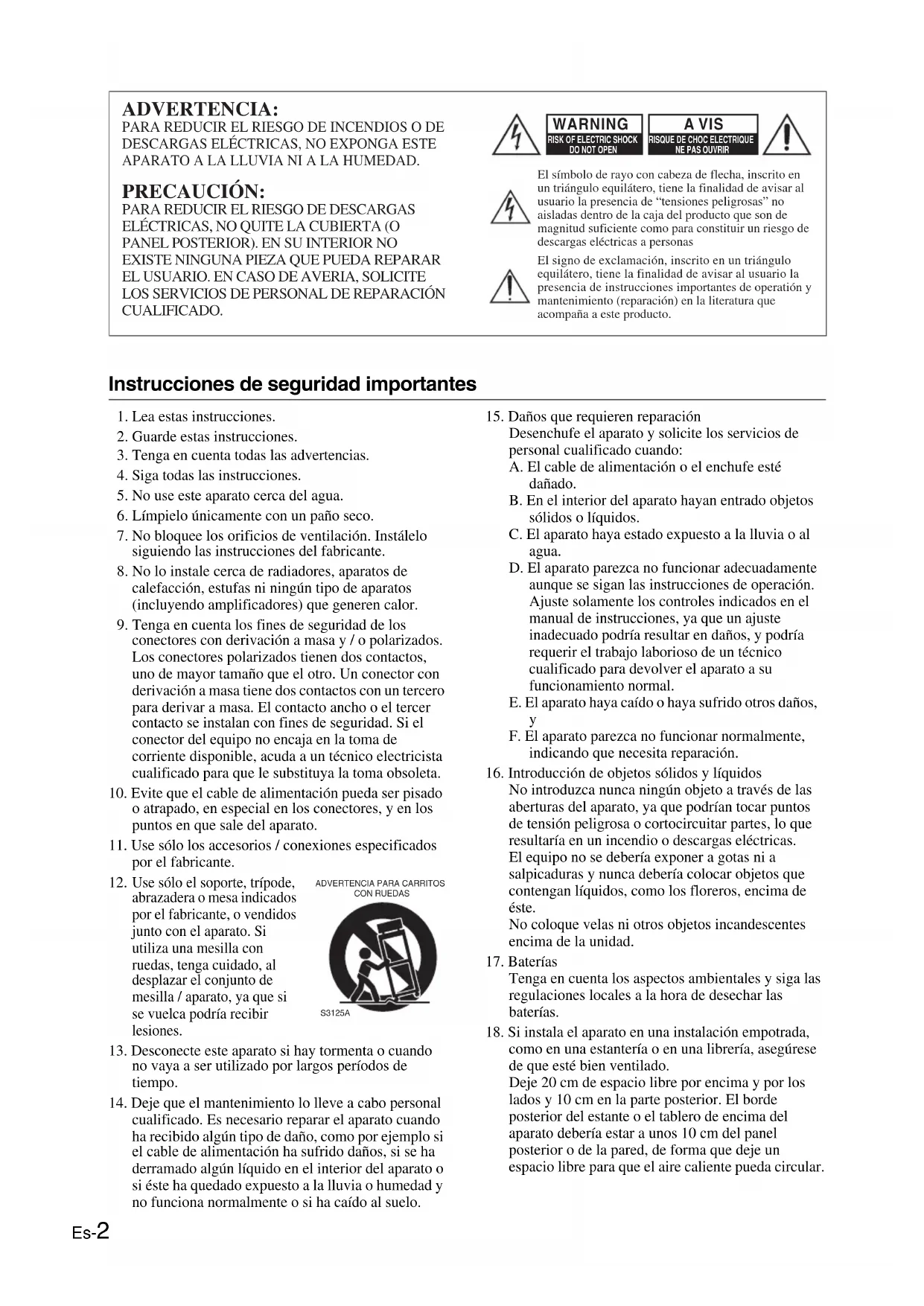 Instrucciones de seguridad importantes 1. Lea estas instrucciones.2. Guarde estas instrucciones.3. Tenga en cuenta todas las advertencias.4. Siga todas las instrucciones.5. No use este aparato cerca del agua.6. Límpielo únicamente con un paño seco.7. No bloquee los orificios de ventilación. Instálelo siguiendo las instrucciones del fabricante.8. No lo instale cerca de radiadores, aparatos de calefacción, estufas ni ningún tipo de aparatos (incluyendo amplificadores) que generen calor.9. Tenga en cuenta los fines de seguridad de los conectores con derivación a masa y / o polarizados. Los conectores polarizados tienen dos contactos, uno de mayor tamaño que el otro. Un conector con derivación a masa tiene dos contactos con un tercero para derivar a masa. El contacto ancho o el tercer contacto se instalan con fines de seguridad. Si el conector del equipo no encaja en la toma de corriente disponible, acuda a un técnico electricista cualificado para que le substituya la toma obsoleta.10. Evite que el cable de alimentación pueda ser pisado o atrapado, en especial en los conectores, y en los puntos en que sale del aparato.11. Use sólo los accesorios / conexiones especificados por el fabricante. 12. Use sólo el soporte, trípode, abrazadera o mesa indicados por el fabricante, o vendidos junto con el aparato. Si utiliza una mesilla con ruedas, tenga cuidado, al desplazar el conjunto de mesilla / aparato, ya que si se vuelca podría recibir lesiones.13. Desconecte este aparato si hay tormenta o cuando no vaya a ser utilizado por largos períodos de tiempo.14. Deje que el mantenimiento lo lleve a cabo personal cualificado. Es necesario reparar el aparato cuando ha recibido algún tipo de daño, como por ejemplo si el cable de alimentación ha sufrido daños, si se ha derramado algún líquido en el interior del aparato o si éste ha quedado expuesto a la lluvia o humedad y no funciona normalmente o si ha caído al suelo.15. Daños que requieren reparaciónDesenchufe el aparato y solicite los servicios de personal cualificado cuando:A. El cable de alimentación o el enchufe esté dañado.B. En el interior del aparato hayan entrado objetos sólidos o líquidos.C. El aparato haya estado expuesto a la lluvia o al agua.D. El aparato parezca no funcionar adecuadamente aunque se sigan las instrucciones de operación. Ajuste solamente los controles indicados en el manual de instrucciones, ya que un ajuste inadecuado podría resultar en daños, y podría requerir el trabajo laborioso de un técnico cualificado para devolver el aparato a su funcionamiento normal.E. El aparato haya caído o haya sufrido otros daños, y F. El aparato parezca no funcionar normalmente, indicando que necesita reparación.16. Introducción de objetos sólidos y líquidosNo introduzca nunca ningún objeto a través de las aberturas del aparato, ya que podrían tocar puntos de tensión peligrosa o cortocircuitar partes, lo que resultaría en un incendio o descargas eléctricas. El equipo no se debería exponer a gotas ni a salpicaduras y nunca debería colocar objetos que contengan líquidos, como los floreros, encima de éste.No coloque velas ni otros objetos incandescentes encima de la unidad. 17. BateríasTenga en cuenta los aspectos ambientales y siga las regulaciones locales a la hora de desechar las baterías.18. Si instala el aparato en una instalación empotrada, como en una estantería o en una librería, asegúrese de que esté bien ventilado.Deje 20 cm de espacio libre por encima y por los lados y 10 cm en la parte posterior. El borde posterior del estante o el tablero de encima del aparato debería estar a unos 10 cm del panel posterior o de la pared, de forma que deje un espacio libre para que el aire caliente pueda circular. ADVERTENCIA: PARA REDUCIR EL RIESGO DE INCENDIOS O DE DESCARGAS ELÉCTRICAS, NO EXPONGA ESTE APARATO A LA LLUVIA NI A LA HUMEDAD. PRECAUCIÓN: PARA REDUCIR EL RIESGO DE DESCARGAS ELÉCTRICAS, NO QUITE LA CUBIERTA (O PANEL POSTERIOR). EN SU INTERIOR NO EXISTE NINGUNA PIEZA QUE PUEDA REPARAR EL USUARIO. EN CASO DE AVERIA, SOLICITE LOS SERVICIOS DE PERSONAL DE REPARACIÓN CUALIFICADO.El símbolo de rayo con cabeza de flecha, inscrito en un triángulo equilátero, tiene la finalidad de avisar al usuario la presencia de “tensiones peligrosas” no aisladas dentro de la caja del producto que son de magnitud suficiente como para constituir un riesgo de descargas eléctricas a personasEl signo de exclamación, inscrito en un triángulo equilátero, tiene la finalidad de avisar al usuario la presencia de instrucciones importantes de operatión y mantenimiento (reparación) en la literatura que acompaña a este producto. WARNING RISK OF ELECTRIC SHOCK DO NOT OPEN RISQUE DE CHOC ELECTRIQUE NE PAS OUVRIR A VIS ADVERTENCIA PARA CARRITOS CON RUEDAS S3125AEs-3