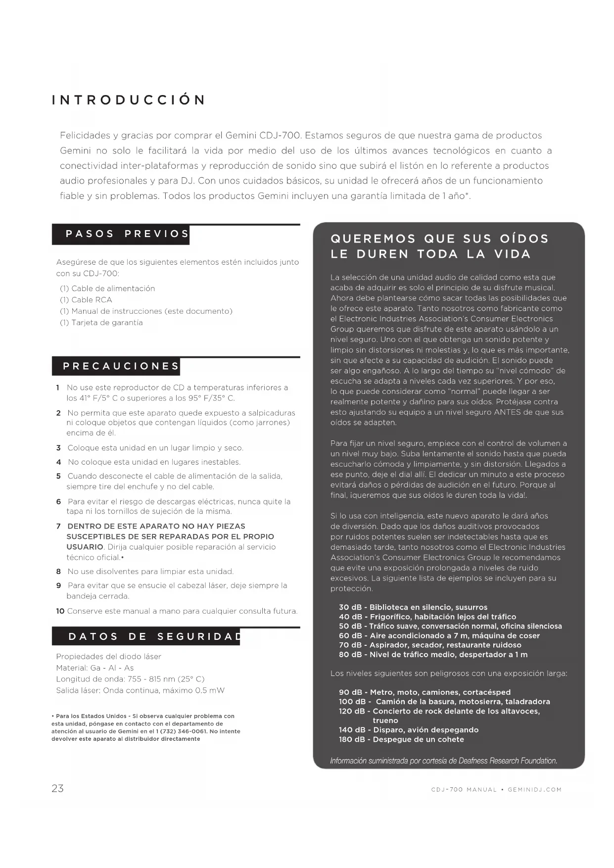 23 Asegúrese de que los siguientes elementos estén incluidos junto con su CDJ-700:(1) Cable de alimentación (1) Cable RCA(1) Manual de instrucciones (este documento)(1) Tarjeta de garantía 1 No use este reproductor de CD a temperaturas inferiores a los 41° F/5° C o superiores a los 95° F/35° C.2 No permita que este aparato quede expuesto a salpicaduras ni coloque objetos que contengan líquidos (como jarrones) encima de él.3 Coloque esta unidad en un lugar limpio y seco.4 No coloque esta unidad en lugares inestables.5 Cuando desconecte el cable de alimentación de la salida, siempre tire del enchufe y no del cable.6 Para evitar el riesgo de descargas eléctricas, nunca quite la tapa ni los tornillos de sujeción de la misma.7 DENTRO DE ESTE APARATO NO HAY PIEZAS SUSCEPTIBLES DE SER REPARADAS POR EL PROPIO USUARIO. Dirija cualquier posible reparación al servicio técnico oficial.•8 No use disolventes para limpiar esta unidad.9 Para evitar que se ensucie el cabezal láser, deje siempre la bandeja cerrada.10 Conserve este manual a mano para cualquier consulta futura.Propiedades del diodo láserMaterial: Ga - Al - AsLongitud de onda: 755 - 815 nm (25° C)Salida láser: Onda continua, máximo 0.5 mWLa selección de una unidad audio de calidad como esta que acaba de adquirir es solo el principio de su disfrute musical. Ahora debe plantearse cómo sacar todas las posibilidades que le ofrece este aparato. Tanto nosotros como fabricante como el Electronic Industries Association’s Consumer Electronics Group queremos que disfrute de este aparato usándolo a un nivel seguro. Uno con el que obtenga un sonido potente y limpio sin distorsiones ni molestias y, lo que es más importante, sin que afecte a su capacidad de audición. El sonido puede ser algo engañoso. A lo largo del tiempo su “nivel cómodo” de escucha se adapta a niveles cada vez superiores. Y por eso, lo que puede considerar como “normal” puede llegar a ser realmente potente y dañino para sus oídos. Protéjase contra esto ajustando su equipo a un nivel seguro ANTES de que sus oídos se adapten. Para fijar un nivel seguro, empiece con el control de volumen a un nivel muy bajo. Suba lentamente el sonido hasta que pueda escucharlo cómoda y limpiamente, y sin distorsión. Llegados a ese punto, deje el dial allí. El dedicar un minuto a este proceso evitará daños o pérdidas de audición en el futuro. Porque al final, ¡queremos que sus oídos le duren toda la vida!.Si lo usa con inteligencia, este nuevo aparato le dará años de diversión. Dado que los daños auditivos provocados por ruidos potentes suelen ser indetectables hasta que es demasiado tarde, tanto nosotros como el Electronic Industries Association’s Consumer Electronics Group le recomendamos que evite una exposición prolongada a niveles de ruido excesivos. La siguiente lista de ejemplos se incluyen para su protección.30 dB - Biblioteca en silencio, susurros40 dB - Frigorífico, habitación lejos del tráfico50 dB - Tráfico suave, conversación normal, oficina silenciosa60 dB - Aire acondicionado a 7 m, máquina de coser70 dB - Aspirador, secador, restaurante ruidoso80 dB - Nivel de tráfico medio, despertador a 1 mLos niveles siguientes son peligrosos con una exposición larga:90 dB - Metro, moto, camiones, cortacésped100 dB - Camión de la basura, motosierra, taladradora120 dB - Concierto de rock delante de los altavoces, trueno140 dB - Disparo, avión despegando 180 dB - Despegue de un coheteInformación suministrada por cortesía de Deafness Research Foundation.Felicidades y gracias por comprar el Gemini CDJ-700. Estamos seguros de que nuestra gama de productos Gemini no solo le facilitará la vida por medio del uso de los últimos avances tecnológicos en cuanto a conectividad inter-plataformas y reproducción de sonido sino que subirá el listón en lo referente a productos audio profesionales y para DJ. Con unos cuidados básicos, su unidad le ofrecerá años de un funcionamiento fiable y sin problemas. Todos los productos Gemini incluyen una garantía limitada de 1 año*. q u e r e m o s q u e s u s o í d o s